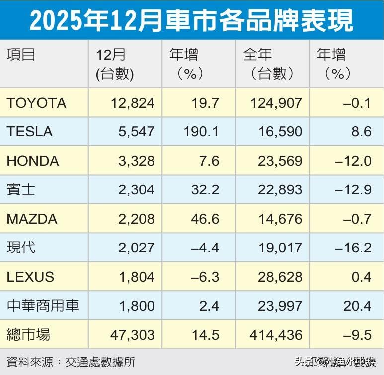 2025年,中国台湾地区汽车市场受关税与货物税调降的冲击,购车热情遭受重创。不过在年底前,车市终于迎来了转机。特别是特斯拉,单月挂牌量猛增至5547台。这使得12月汽车市场的总领牌数量达到了47303台,与去年同期相比增长了14.5%,环比增长更是高达29.7%。在这一带动下,2025年全年汽车市场的销量达到414436台,年降幅收窄至9.5%。 (数据源自网络,仅供参考)