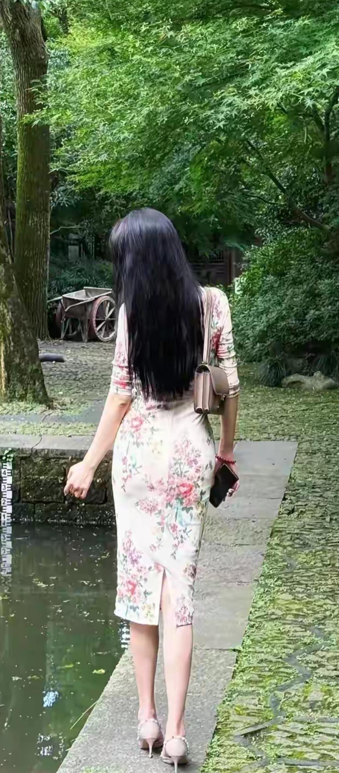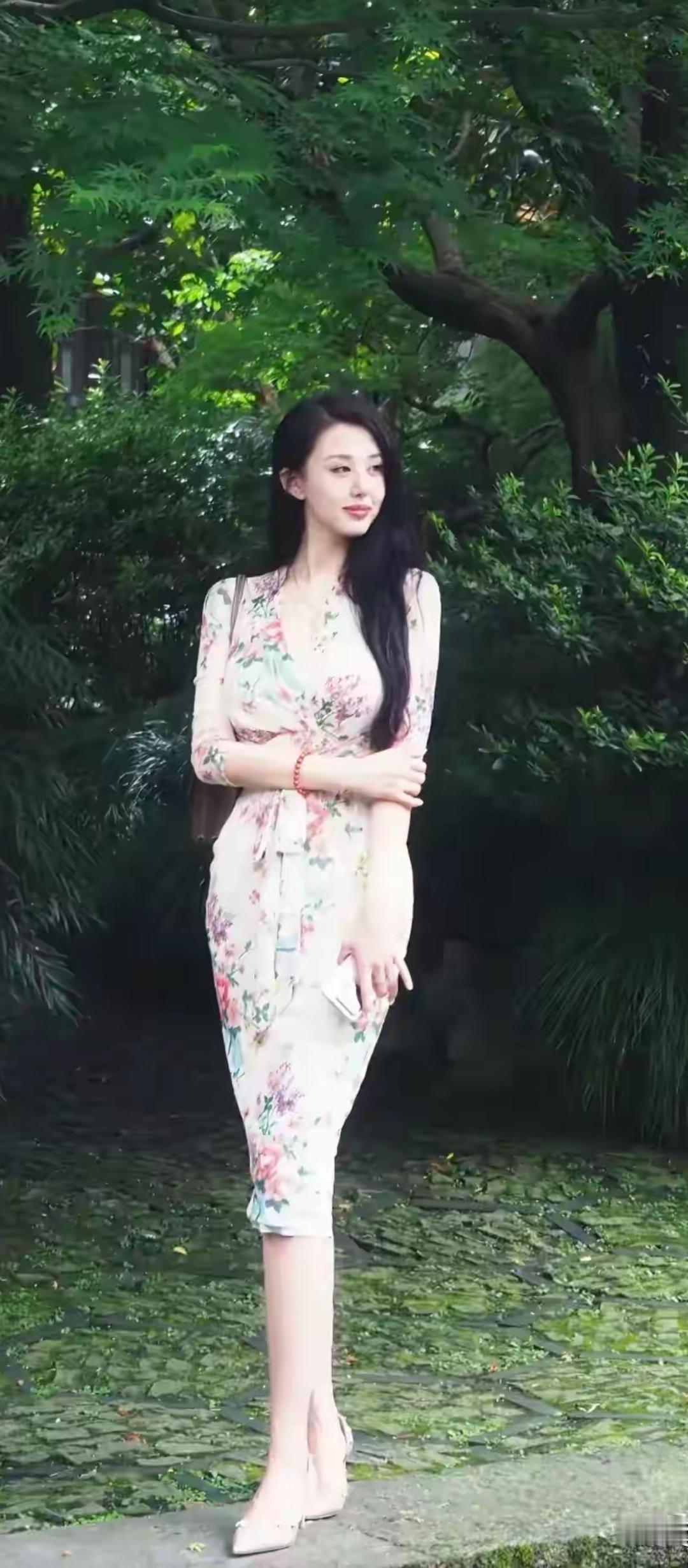 在绿意盎然的森林中,优雅的女士穿着花卉连衣裙,享受宁静的时光。