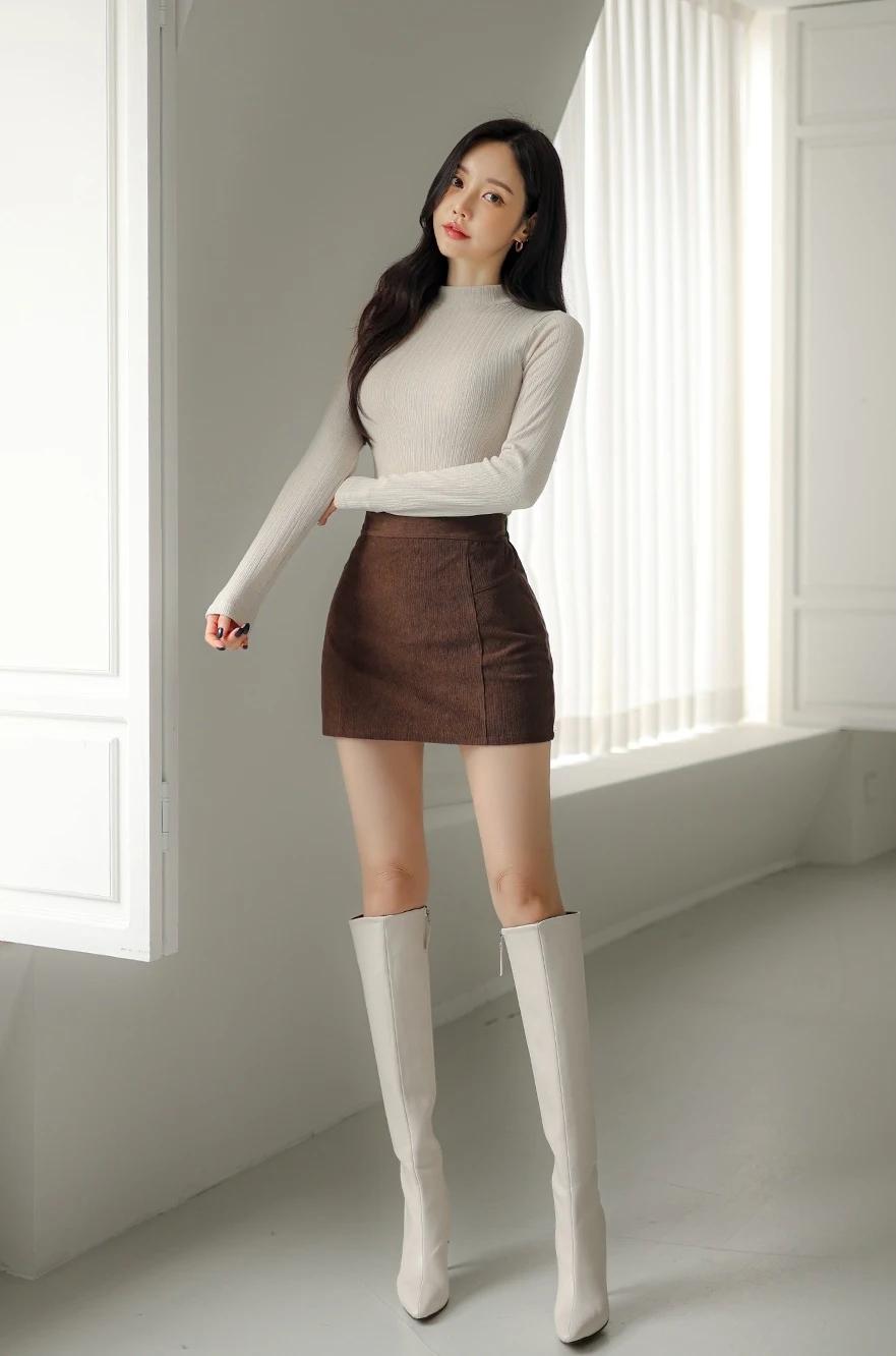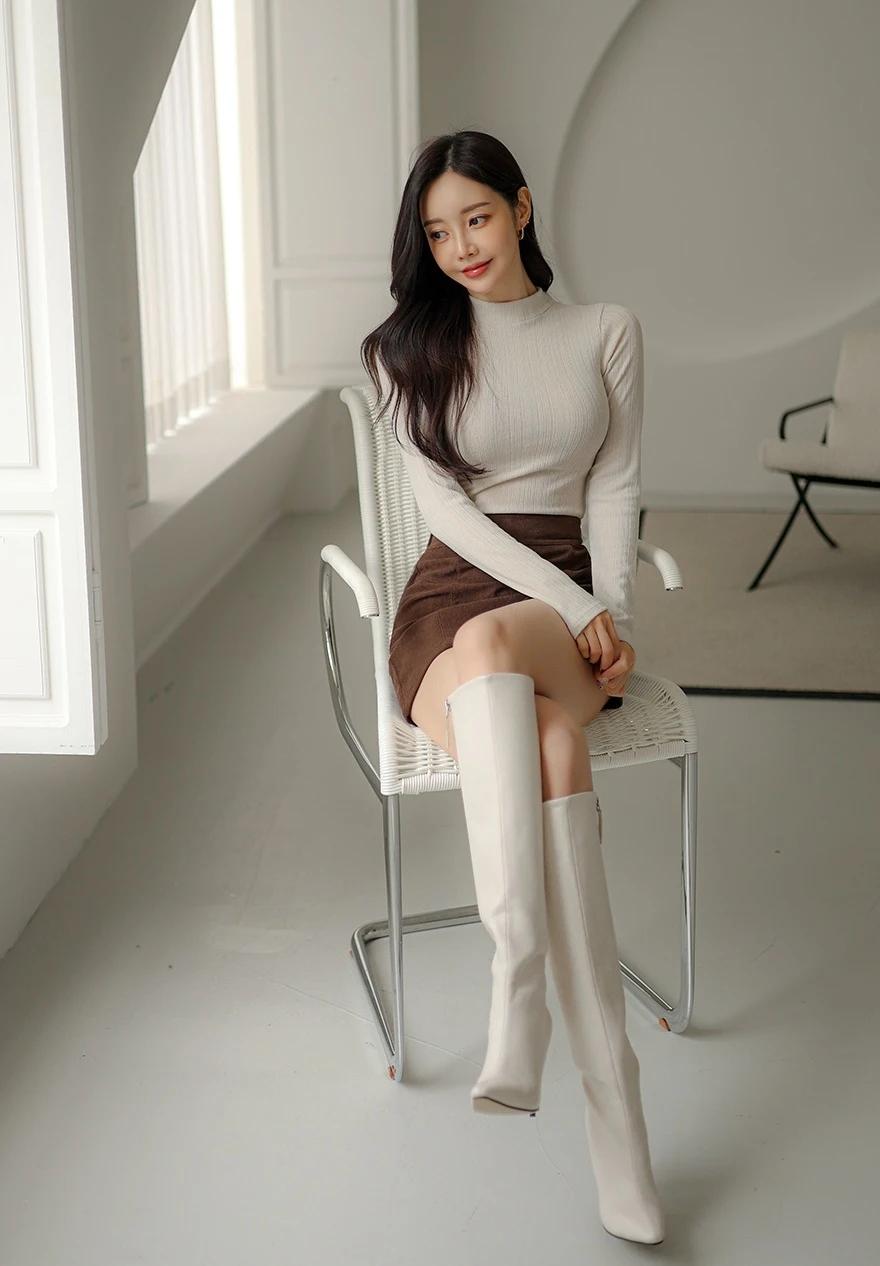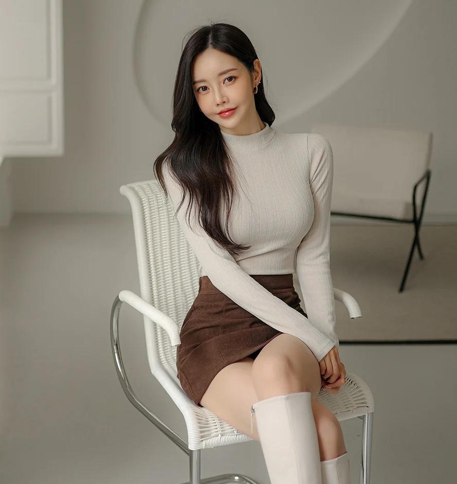 孙允珠-温柔甜美的少女,白色毛衣搭配棕色短裙,坐在白色椅子上,微笑着看向镜头。你喜欢怎样的日常穿搭呢 今天最感慨的一句话 连衣裙怎么穿温柔又日常?