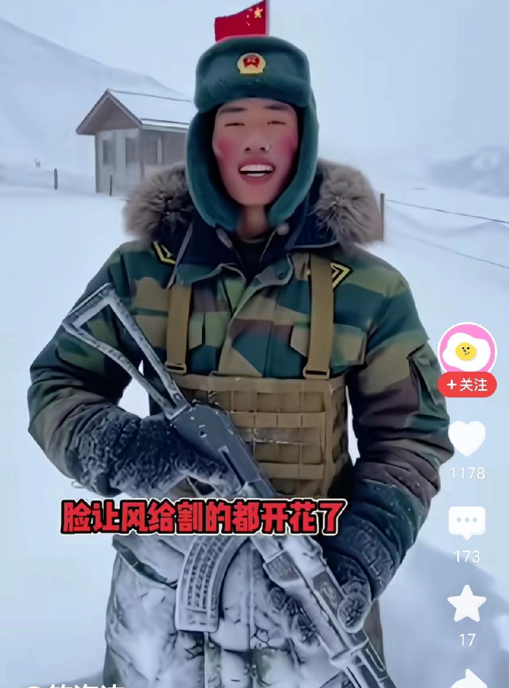 致敬国门卫士致敬边防军人 寒风凛冽,大雪纷飞,年轻的边防战士,手握钢枪,守卫国门。 年轻的脸庞,冻的通红通红,但依然面对镜头微笑着说: “你看,我的脸让风割的都开花了。我这样子,帅吗?” 这视频让我看的,瞬间热泪盈眶。 我只想说: 年轻的战士,你很帅!非常帅!你最帅! 你脸上被寒风割开的的“花”,就是最美的军功章🎖 因为你们的守护,我们的岁月才如此静好! 最帅的战士,祖国和人民感谢你🙏🙏