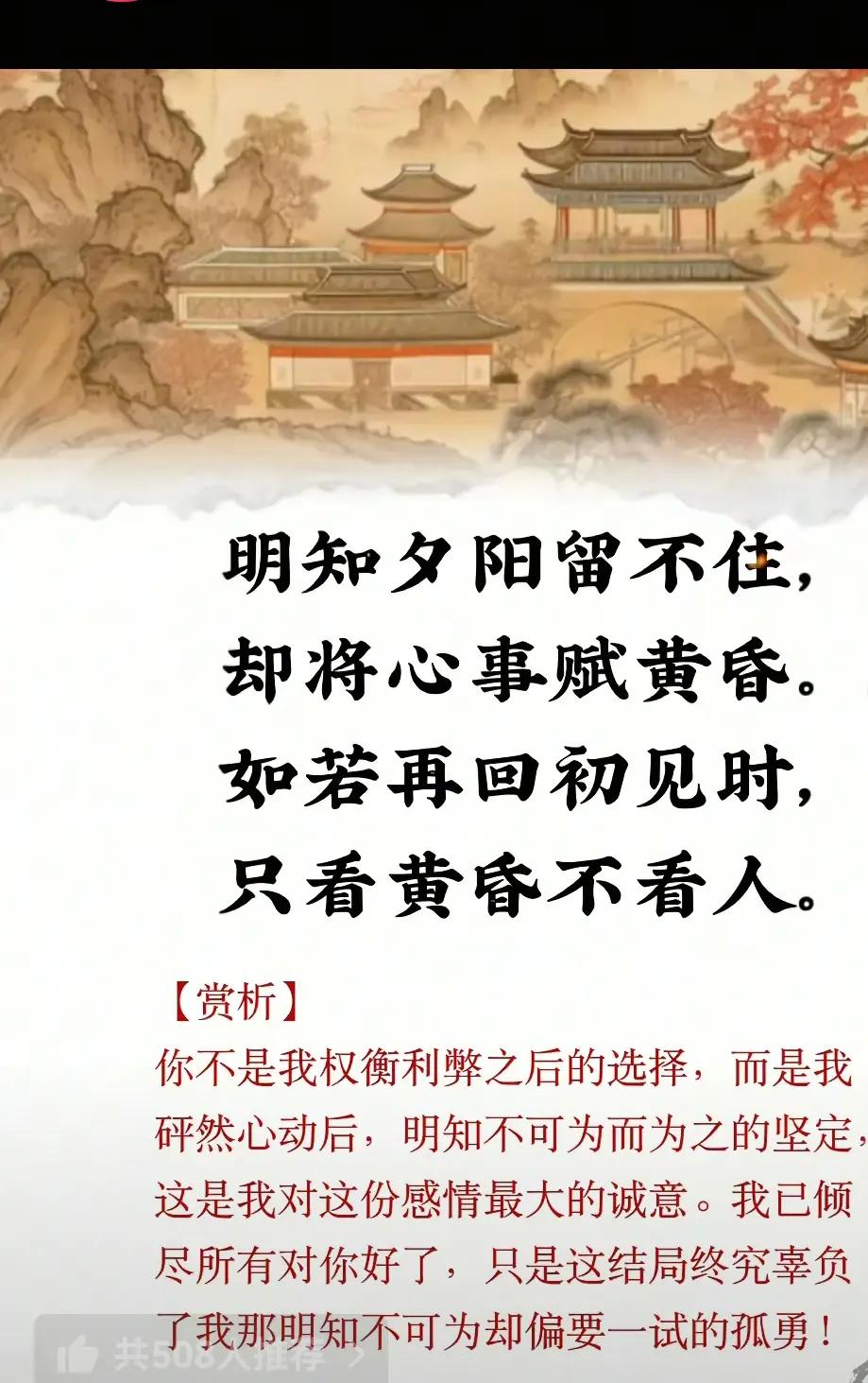 你不是我权衡利弊之后的选择,而是我砰然心动后,明知不可为而为之的坚定,这是我对这份感情最大的诚意。我已倾尽所有对你好了,只是这结局终究辜负了我那明知不可为却偏要一试的孤勇!唯美诗句情感 感悟正能量 国学文化