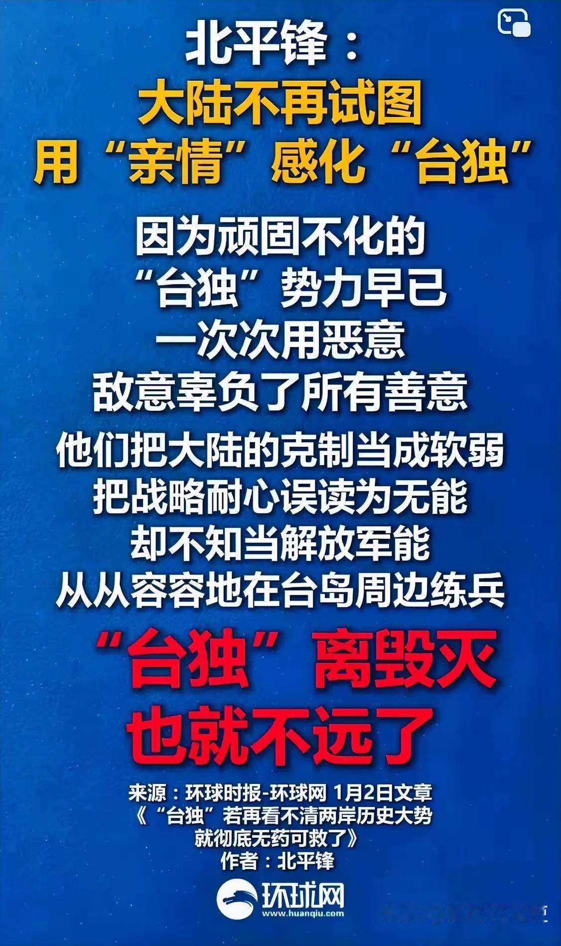 “大陆不再试图用善意来感化台独”,这是北平锋在新年伊始发出的警告。 当善意一次次被台独分子无视与嘲讽,寒的是全体国人的心。 台独分子更是利用了大陆的善意,一次次挑起事端、制造对立、升级事态。 而在“正义使命”演习中解放军无人机特地航拍101大楼,就是对冥顽不化的台独分子发出的强烈信号。 把装睡的人叫醒,最终靠的是实力,台独的狂妄与嚣张终将被一击而碎。