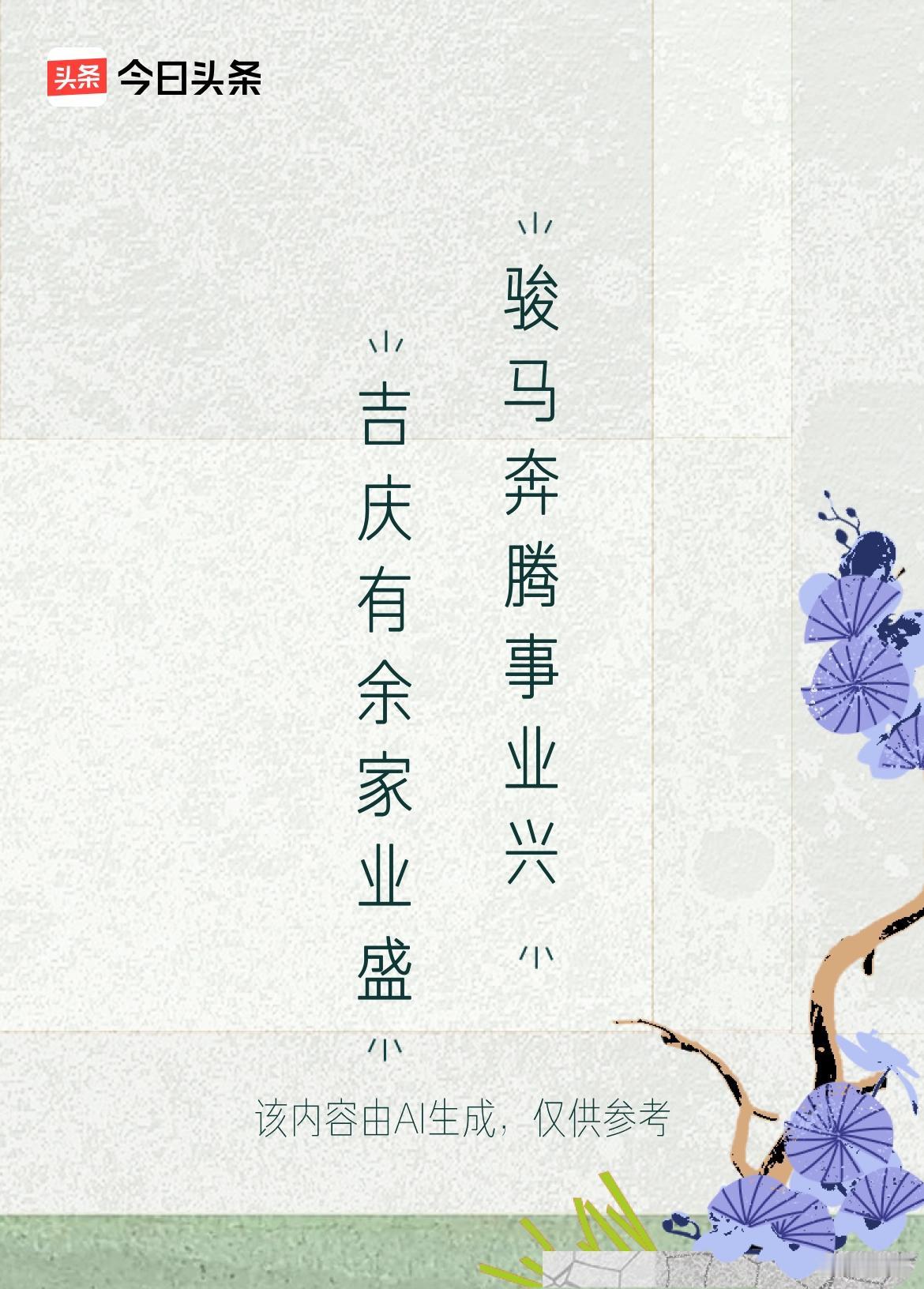 整副对联兼顾家与业两大核心,上联重“家”的安稳兴盛,下联重“业”的蓬勃向上,恰好契合国人“家和业兴”的终极愿景,兼顾温情与壮志。用词直白不晦涩,通俗易懂却不失格调,无论是张贴于家门还是赠予亲友,都适配度极高。“骏马奔腾”的意象更是点睛之笔,跳出普通祝福的平淡,赋予事业发展以动态的力量感,寓意新岁里如骏马扬蹄、乘风破浪,事业一路高歌猛进,与上联的家业兴盛形成呼应,勾勒出家庭和睦、事业顺遂的圆满图景,尽显新春吉庆与奋进朝气,是兼具观赏性与实用性的优质春联