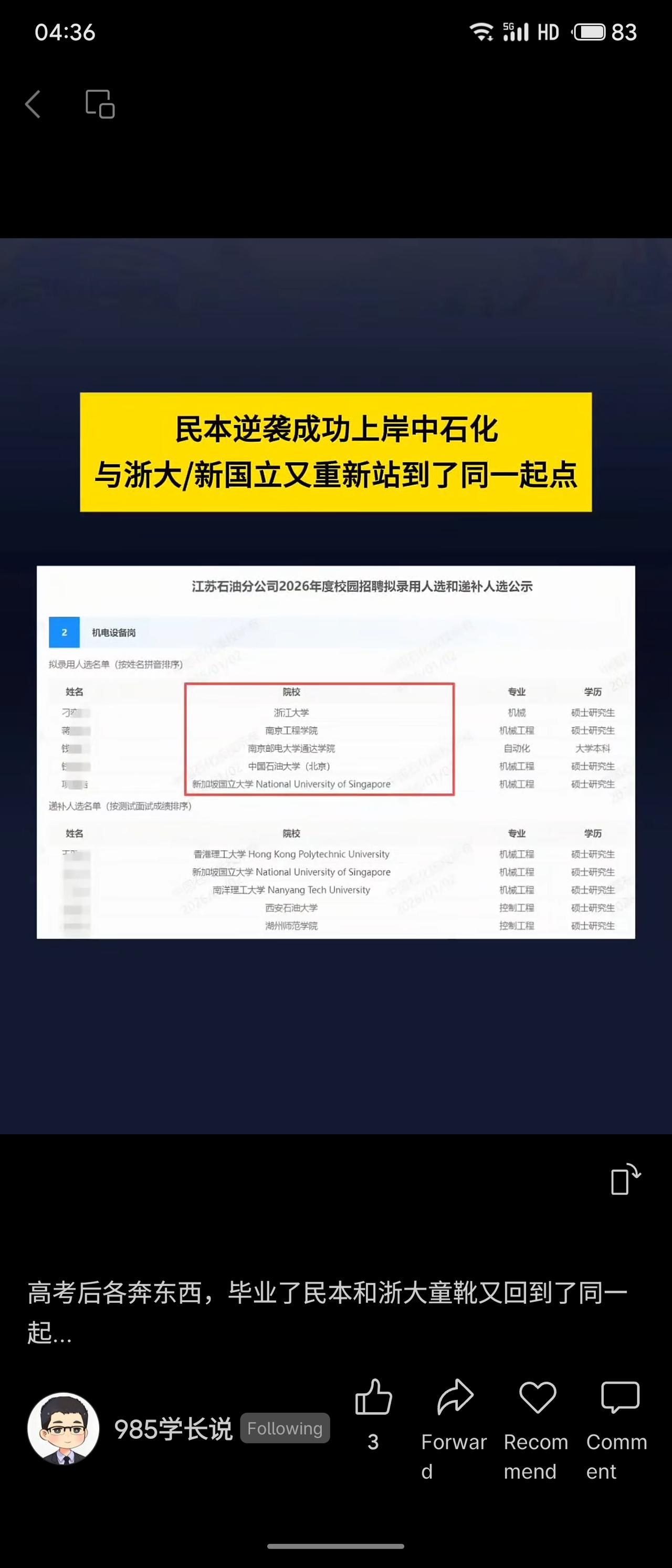 民办本科生逆袭录用中石化,与浙江大学、新加坡国立大学毕业生同列录取名单。图中凸显“民本与名校重回同一起点”,引发对学历与就业起点的讨论。