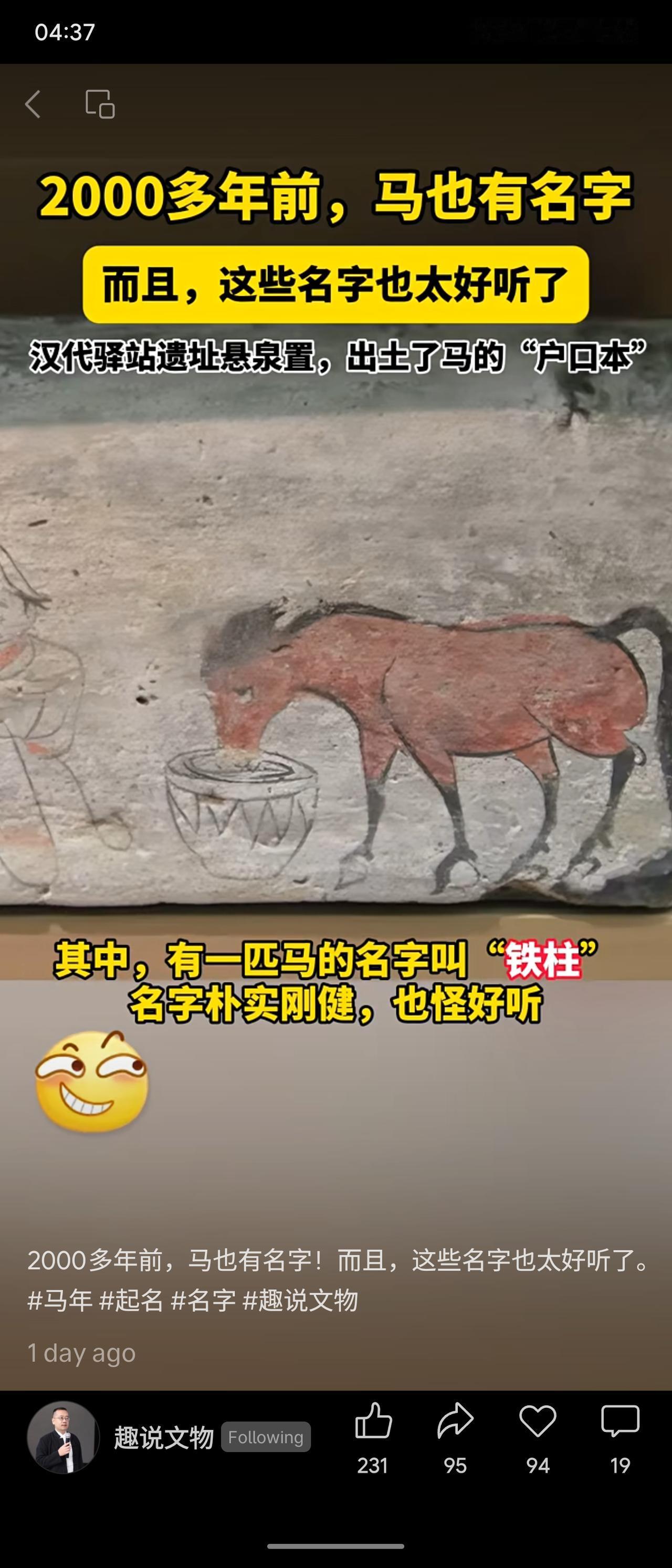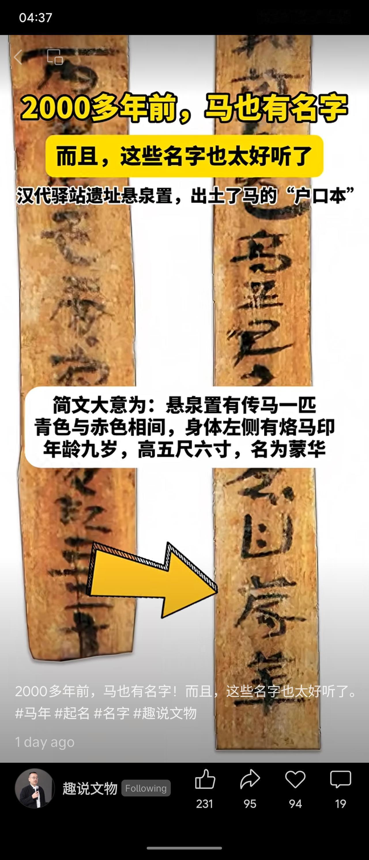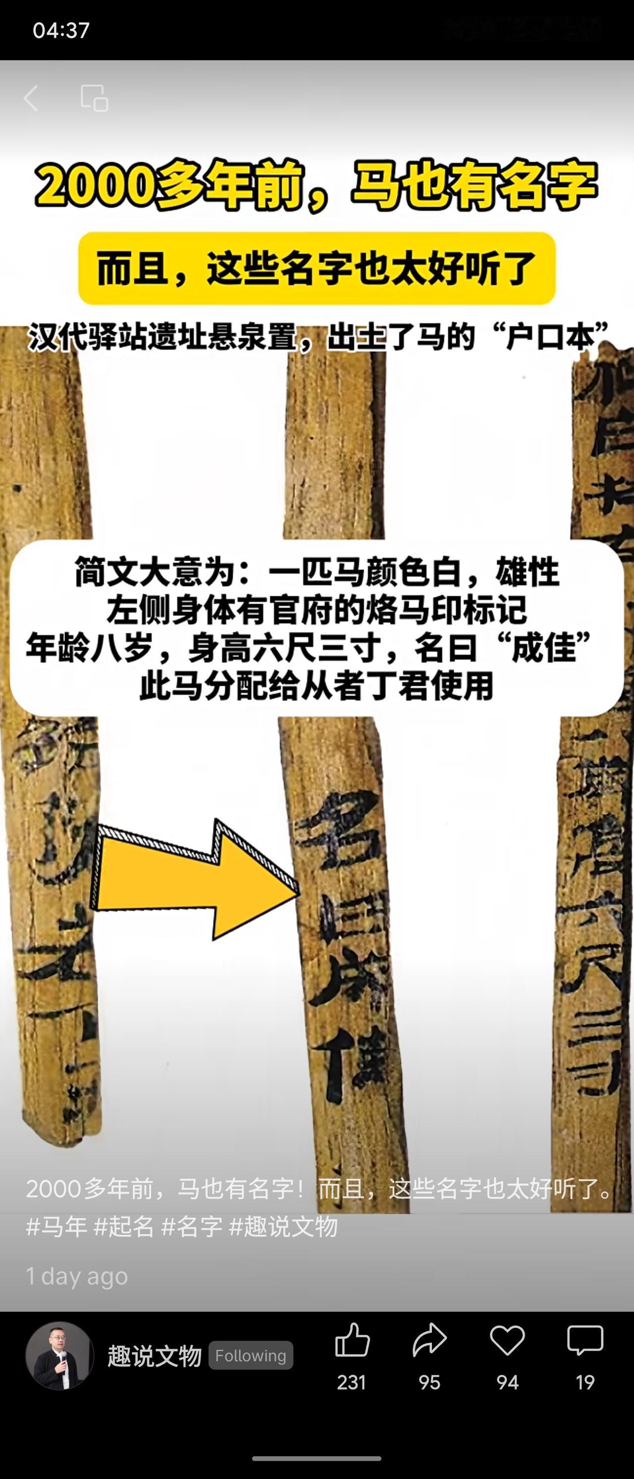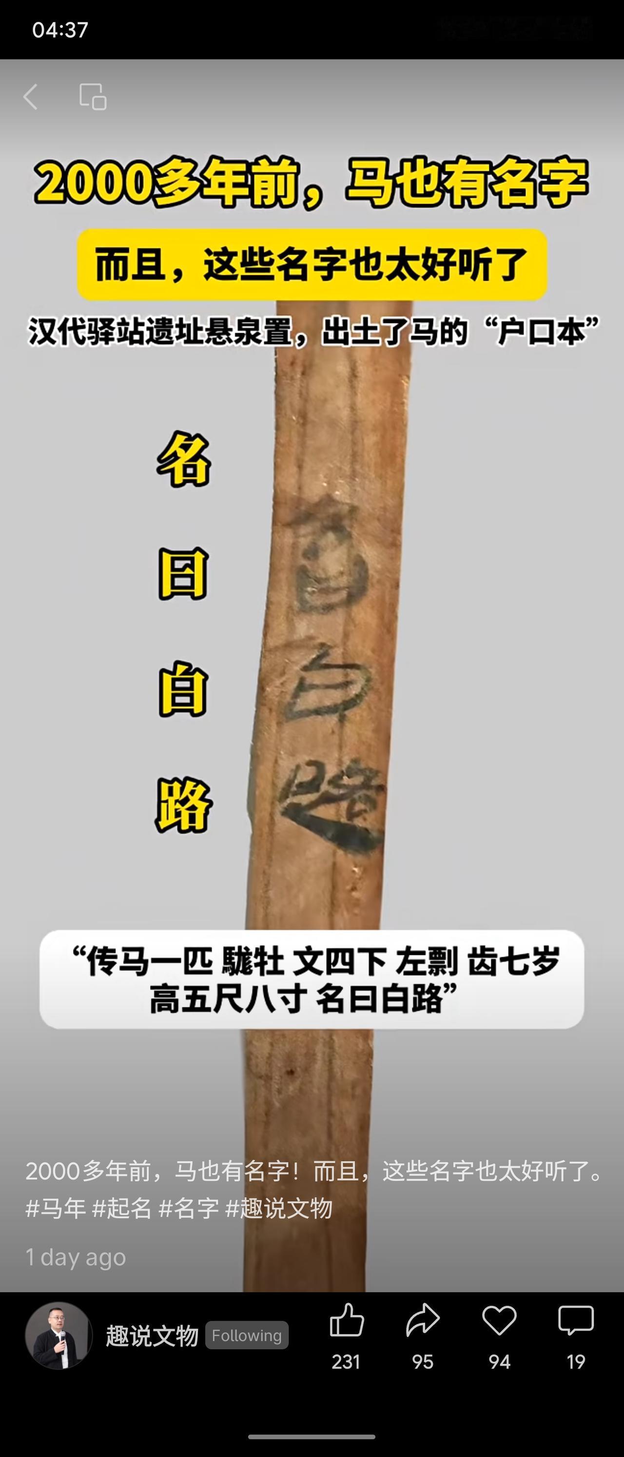 汉代悬泉置驿站遗址出土的简牍,记录了当时马匹的详细户籍信息。这些“马匹户口本”显示,每匹马不仅有年龄、毛色、体高等信息,还被赋予了各具特色的名字,如文雅的“浮云”“镜月”,也有朴实刚健的“铁柱”,体现了古人对马匹的重视与情感。