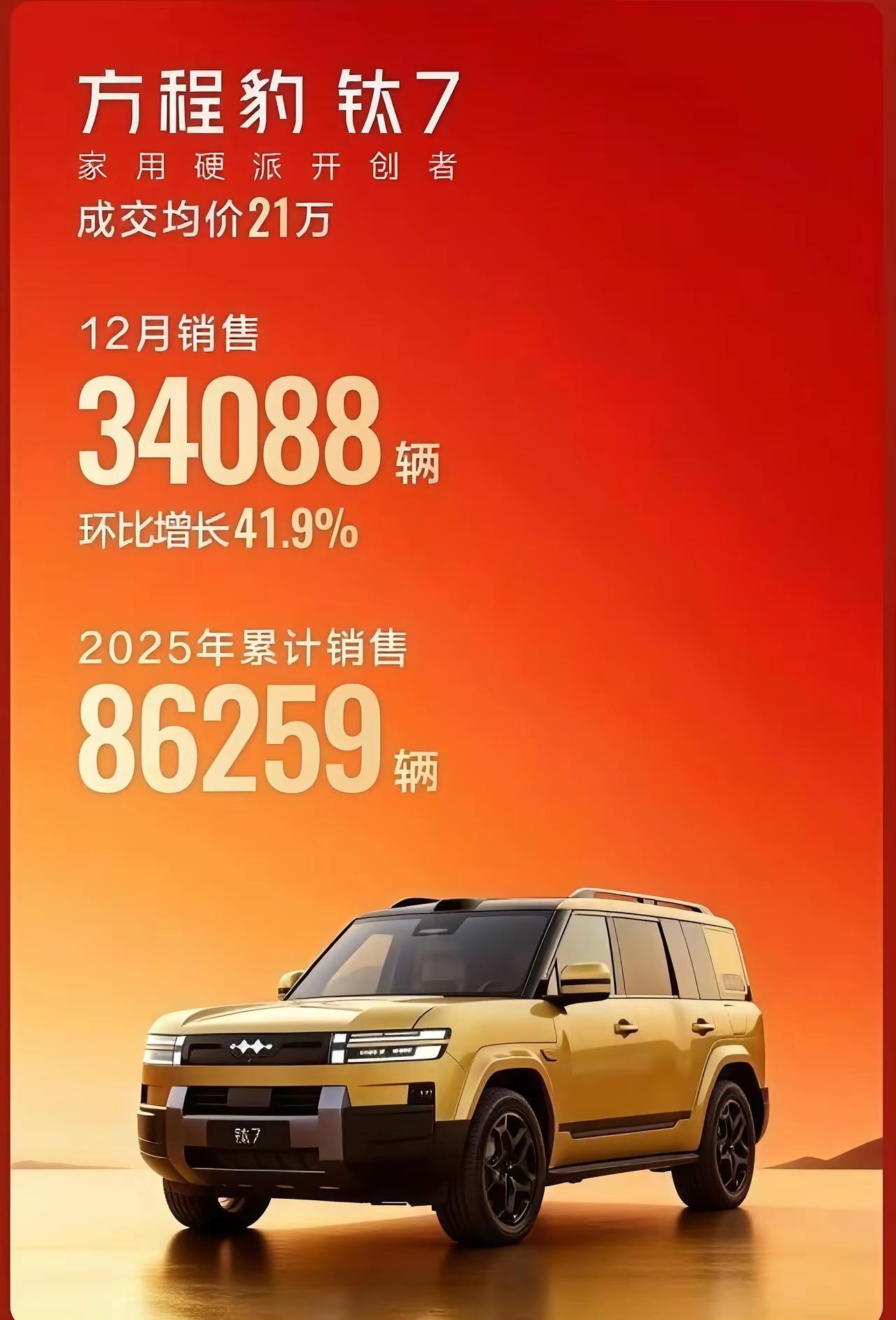 太恐怖了,方程豹钛7,12月份卖了34088辆。 车身尺寸4999x1995x1865mm,轴距2920mm,1.5T插电式混动,低配26.6度电池包,高配35.6度电池包,售价17.98万~21.98万。 这个方头方脑的方盒子,怎么会有如此大的魔力,这样惊人的销量,小米YU7见了都要避让三分。 是价格便宜,还是外形太帅了,还是配置远高同级,方程豹钛7的核心竞争力,到底在哪里? 同级别没一个能打得过它,谁能预料到,方程豹钛7能爆款到这种程度。