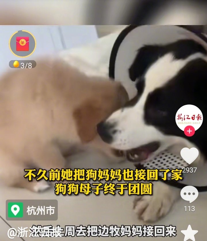 两个月前杭州的牛女士到流浪狗基地领养小狗时,被小狗妈妈拉住了手,牛女士心里很难过很心酸,就在上周,牛女士把小狗妈妈也领养了,它们母子团聚了!感谢流浪狗救助基地,是你们给了它们活下去的希望!感谢牛女士!是你给了狗狗母子一个真正的家!