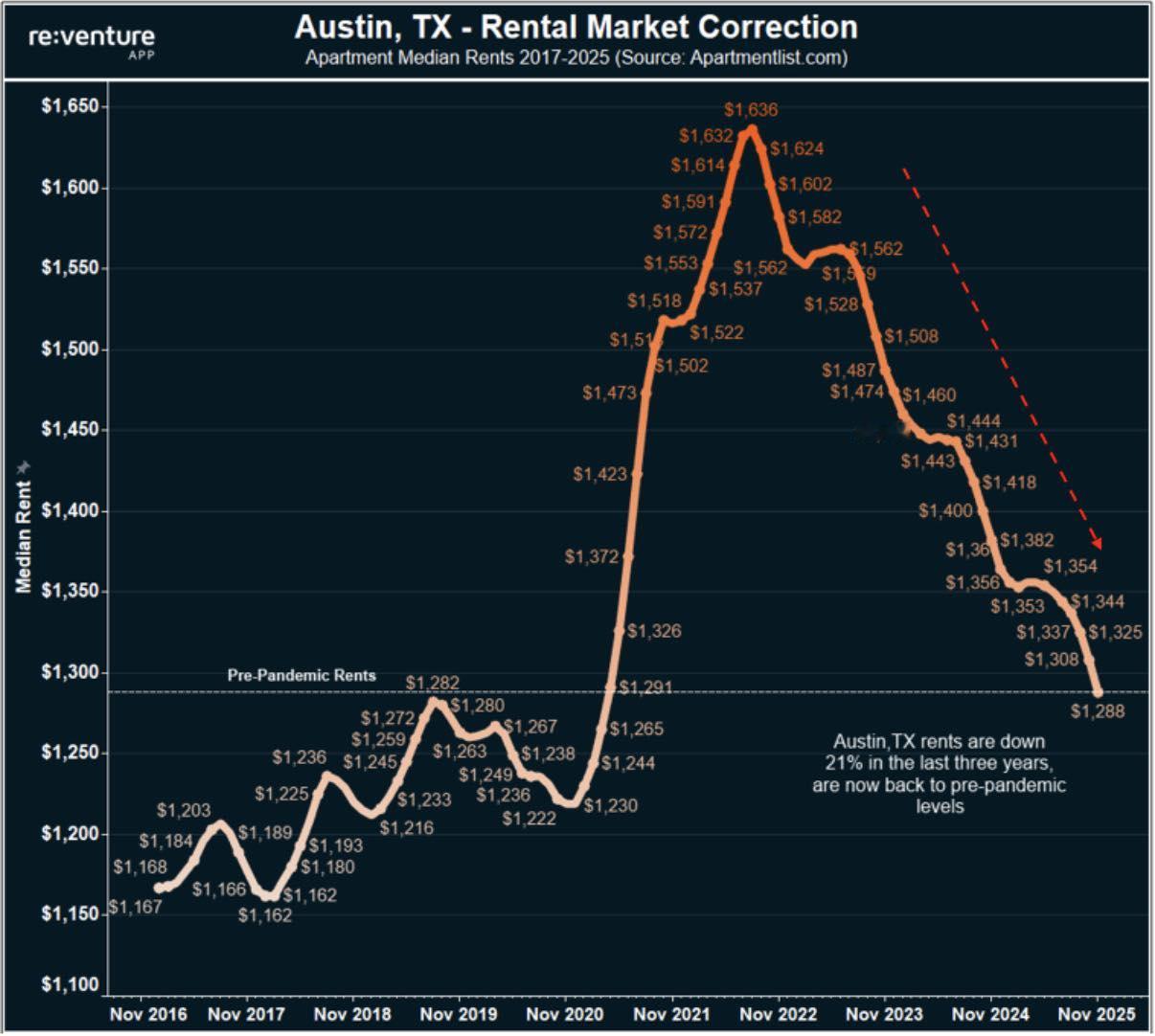 美国得克萨斯州奥斯汀市 2017-2025 年的公寓中位数租金变化(数据来源:Apartmentlist.com)美国得克萨斯州奥斯汀市的公寓租金已正式回落至疫情前水平。较 2022 年夏季的峰值下降了 21%,从每月 1636 美元降至每月 1288 美元。部分公寓社区甚至出现了月租低于 1000 美元的两居室单元。要天天挂机】如今奥斯汀的租金相对于收入而言,达到了有记录以来的最低水平。