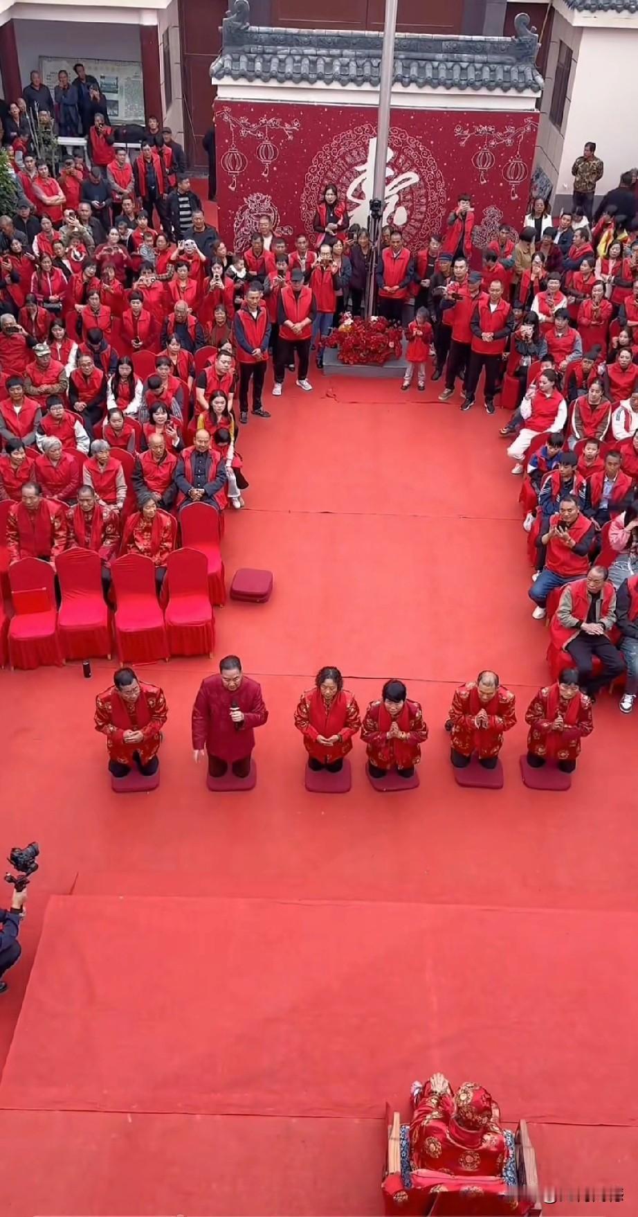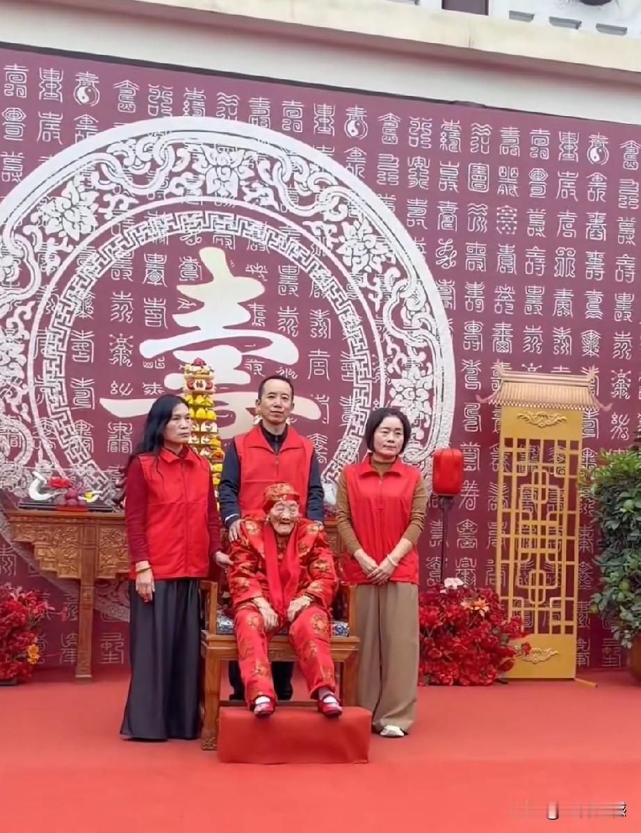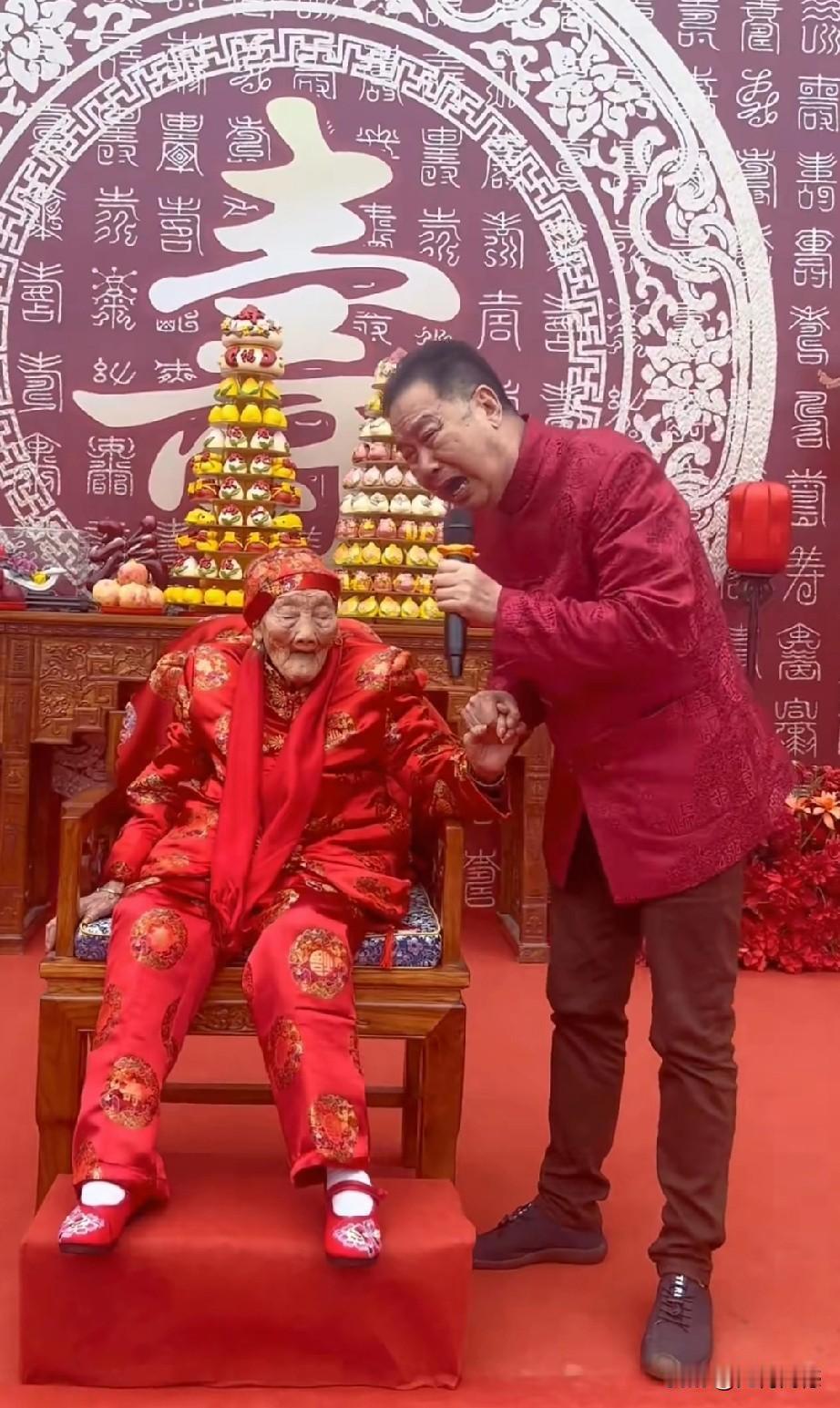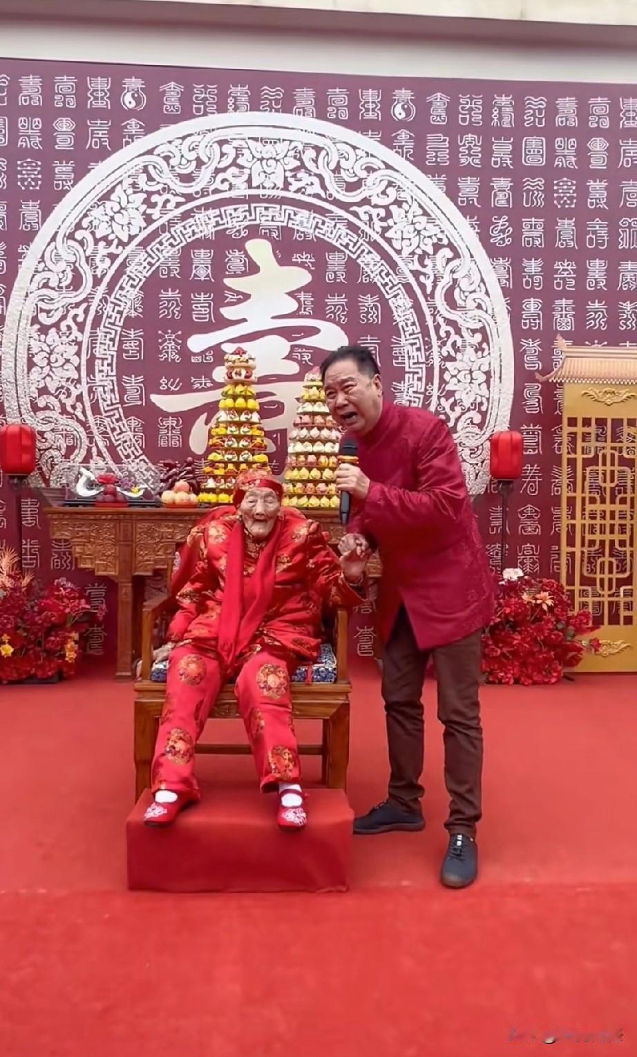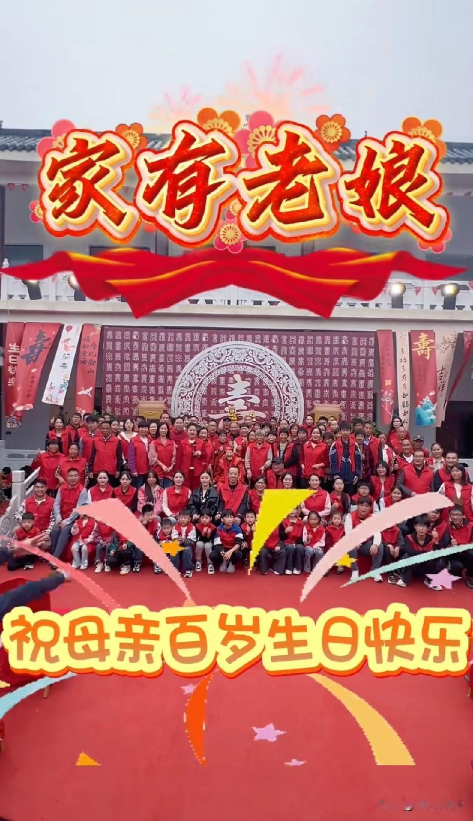 李树建老师的母亲过百岁大寿,场面非常的喜庆,老母亲穿着一身红衣服,整个院子的地面上也都铺着红地毯,参加祝寿的人也都穿着红色的马甲,现场一片红红火火,充满了祥瑞。尤其最感人的,在祝寿仪式上唱的一首歌曲,歌词写的特别真诚,句句都写到心坎上了,听完之后,我落泪了!借这个机会,也祝这个老人身体健康,安享晚年天伦之乐!