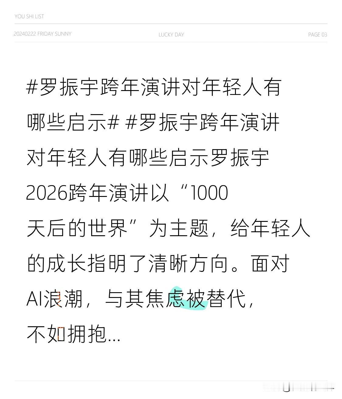 罗振宇2026跨年演讲以“1000天后的世界”为主题,给年轻人的成长指明了清晰方向。面对AI浪潮,与其焦虑被替代,不如拥抱“人机协作”的新范式——AI是托举人的梯子,而非排挤人的对手。 演讲提出的“紫领”职业新形态,启示年轻人要做“跨界解决方案专家”,既懂业务逻辑,又善用AI工具。教育层面,与其纠结“选什么专业安全”,不如培养独特性,就像“微场景设计师”那样,创造专属职业赛道。 核心竞争力从来不在文凭,而在解决真实问题的能力。年轻人要学会“跑在AI上面”,聚焦灵感、价值判断与情感连接这些人类独有优势。更要怀揣“愿力”,在空白领域深耕,以“发大愿、迈小丁”的坚持,在1000天的时间尺度里沉淀成长。 乐观是行动而非看法,AI时代的机会属于主动破局、终身学习的“不可救药的乐观派”。罗振宇晚会 央视跨年演讲