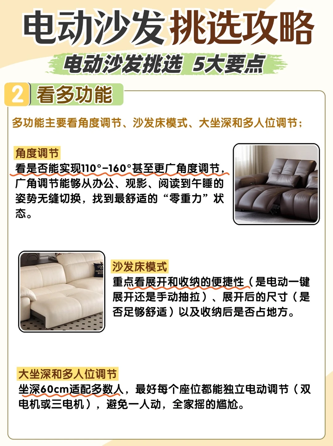 多功能主要看角度调节、沙发床模式、大坐深和多人位调节;