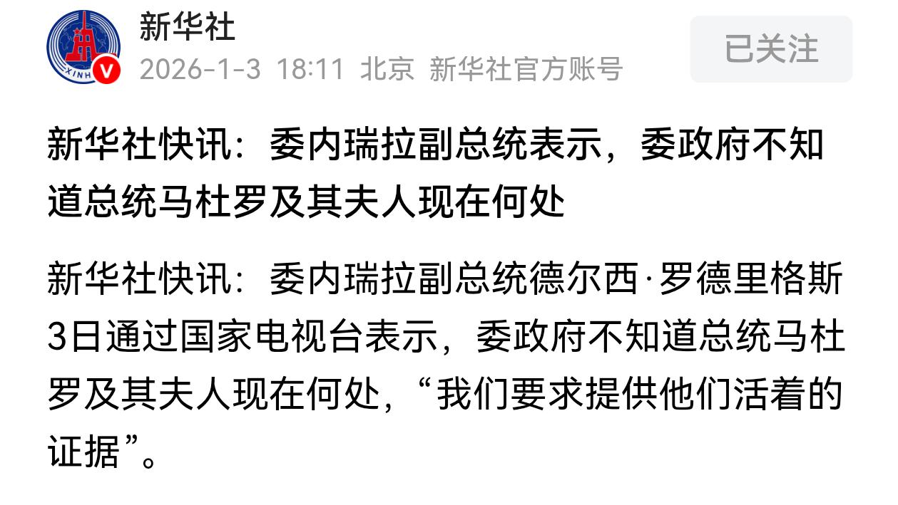 看来这次特朗普大概率没说谎,特朗普称抓获委内瑞拉总统马杜罗及其夫人并带离委内瑞拉,而现在委内瑞拉副总统已经出来表示要求美国提供马杜罗及其夫人活着的证明,现在委内瑞拉政府不知道马杜罗和其夫人在什么地方, 如果真的被美国抓了,那老美这次真的速度太快了,从空袭委内瑞拉首都后不到几小时,就抓了马杜罗的话,要说没有内应的话,是很难办到的,这说明了老美的渗透真的太严重了,这是必须要警惕的!