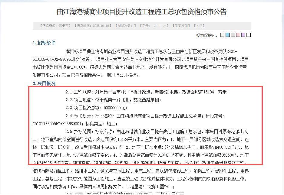 总投资5000万元!西安曲江这个商业项目将进行局部提升改造... 日前,西安公共资源交易中心发布《曲江海港城商业项目提升改造工程施工总承包资格预审公告》,内容显示: 曲江海港城商业项目提升改造工程位于雁南一路北侧,慈恩西路东侧,项目业主为西安金美达商业地产开发有限公司,投资总额5000万元,主要对原负一层商业进行提升改造,新增6部电梯,改造面积约15184平方米; 主要内容为: 1、地下一层部分区域改造为交通空间,连接一层和负一层交通,改造后面积减少496.82㎡; 2、地下一层东南角部分区域增加夹层,面积增加496.82㎡。 3、改造后总建筑面积为81998 ㎡不变,其中地上建筑面积36063㎡、地下面积45935㎡均不变。建筑高度、建筑密度、容积率、绿地率等规划指标均不变。 据悉,曲江海港城商业项目紧邻亚洲最大的唐风商业文化步行街大唐不夜城,目前已由华发集团接手,并已更名为“锦安坊”并开业,是华发集团西北的首个商业项目! 该项目以"意·游·味·境"为核心概念,融合盛唐文化与现代商业,打造了南街雅宴、北巷市井、中庭市集三大开放式主题区。特色亮点包括西北首店"武皇盛宴"的沉浸式宫廷御宴体验,以及24小时运营的夜经济业态组合(如电竞酒店、民谣Livehouse)。外立面采用唐长安"红金绿"经典配色,内部引入了八百里秦川陕菜、MAANUP漫+餐酒吧等多元品牌,形成"文化+商业+夜经济"的复合消费场景。