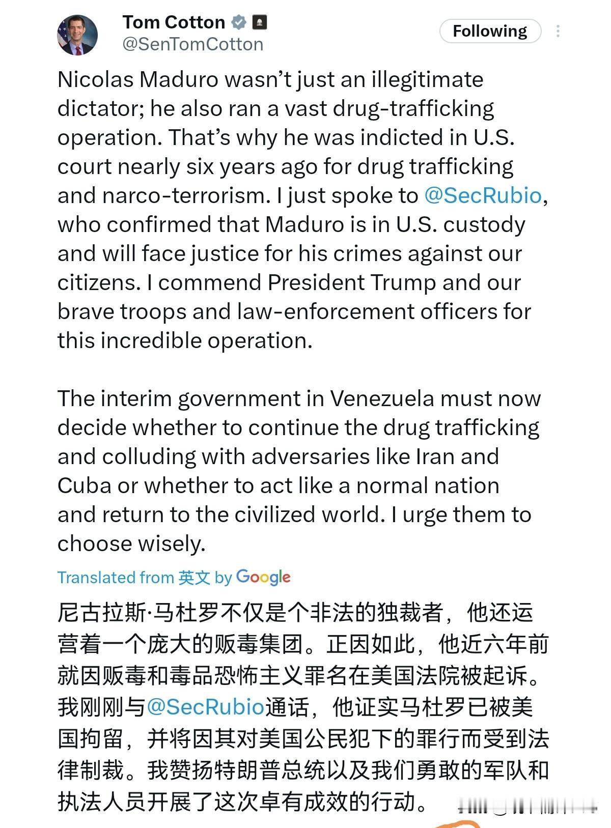 在马杜罗被美国抓捕之后,美国参议员汤姆科顿表示,尼古拉斯·马杜罗不仅是一名不具“合法性”的独裁者,还操控着庞大的贩毒网络。这正是他近六年前因贩毒及贩毒恐怖主义罪名,被美国法院提起公诉的原因。我刚刚与鲁比奥国务卿通话,对方证实马杜罗已被美方羁押,并将因危害我国公民的罪行接受“正义审判”。我为特朗普总统,以及我们英勇的军队与执法人员执行的这次非凡行动表示赞扬。 委内瑞拉临时政府如今必须做出抉择:是继续从事贩毒活动、勾结伊朗和古巴等敌对势力,还是像一个正常国家那样行事,重新回归文明世界。我敦促其做出明智选择。很显然,在马杜罗被美国通过发动战争的方式抓捕之后,美国国内的参议员不认为美国的行为有任何的不妥,仿佛在美国政客眼中,国际法,他国主权与领土完整的权利,完全不存在一样。 明面上,美国是打击毒贩,背地里美国要做的就是在南美推行霸权,染指委内瑞拉的石油。马杜罗是委内瑞拉总统,一个主权国家的总统,美国认定有罪就是有罪,不需要理会任何国际组织,也不经联合国同意,美国就能肆意妄为,还声称这是“正义的审判”,只能说美国奉行的是赤裸裸的丛林法则。抓走马杜罗还不算,美国还继续对委内瑞拉进行威胁,美国是丝毫不掩饰自己的强盗本质。