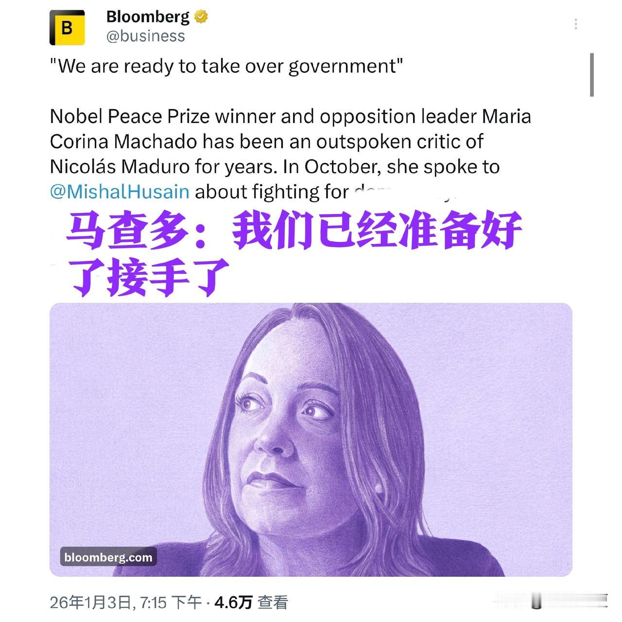 随着马杜罗被带去美国【审判】,看来委内瑞拉人民的【好日子】要来了。那个女人肯定是美国的不二人选——玛利亚·马查多: 1. 新晋诺贝尔和平奖得主 2. 老特本来势在必得和平奖,都让贤于她 3. 耶鲁大学第三世界【变革研究】机构的国际特别协调员 4. 【来轰炸我的祖国,那是爱的行动】呼吁美军快入侵自己祖国。 5. 【请坚信老特对委内瑞拉的战略计划】 6. 马杜罗去美国的消息出来后一个小时,她便现身表示已经准备好接手。 明显大妈等了几十年,都有点等不及了。