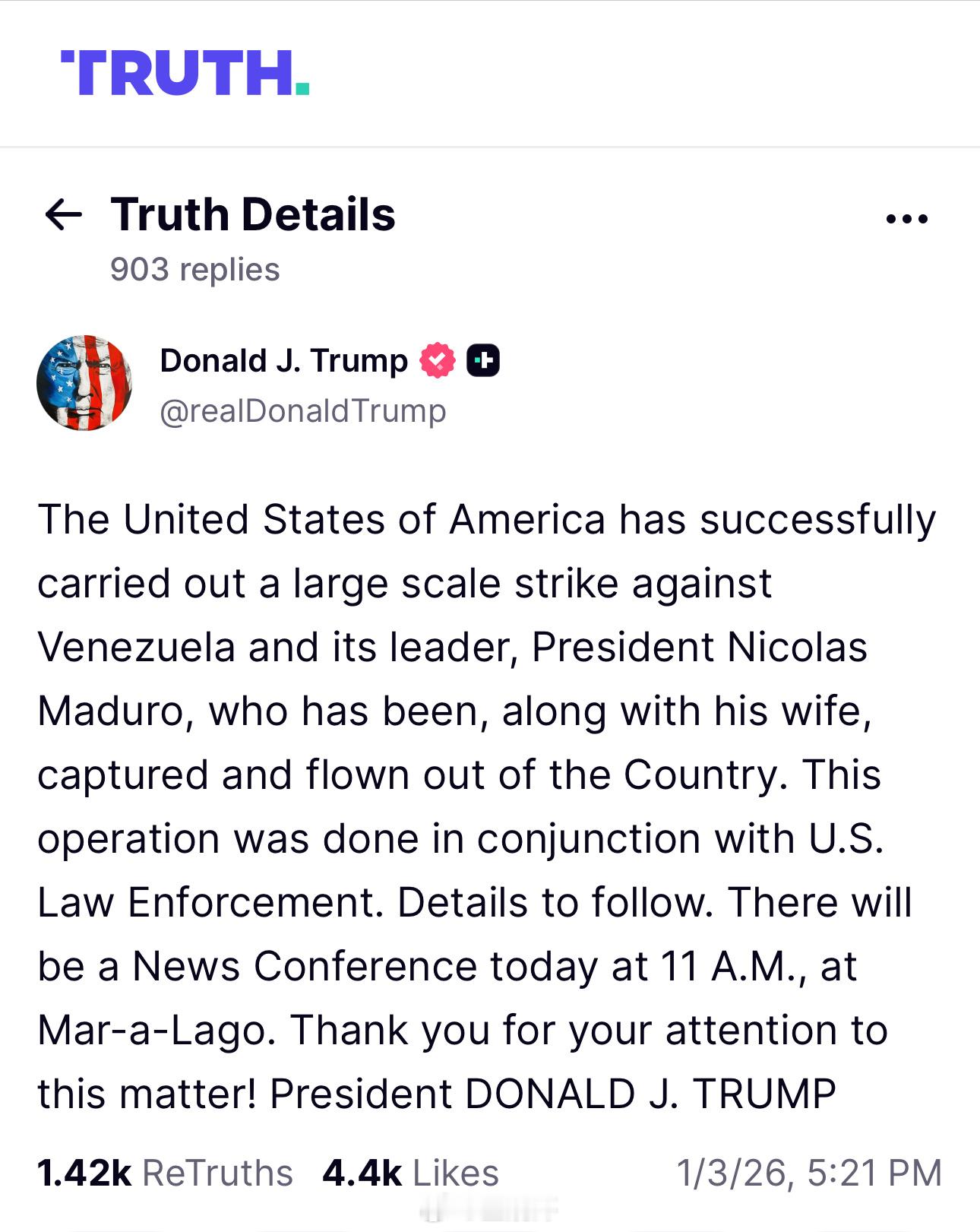 美国总统特朗普:“美国已成功对委内瑞拉及其领导人尼古拉斯·马杜罗总统发动大规模打击。马杜罗总统及其夫人已被抓获并遣送出境。此次行动与美国执法部门联合进行。详情稍后公布。今天上午11点将在海湖庄园举行新闻发布会。感谢您对此事的关注!唐纳德·J·特朗普”