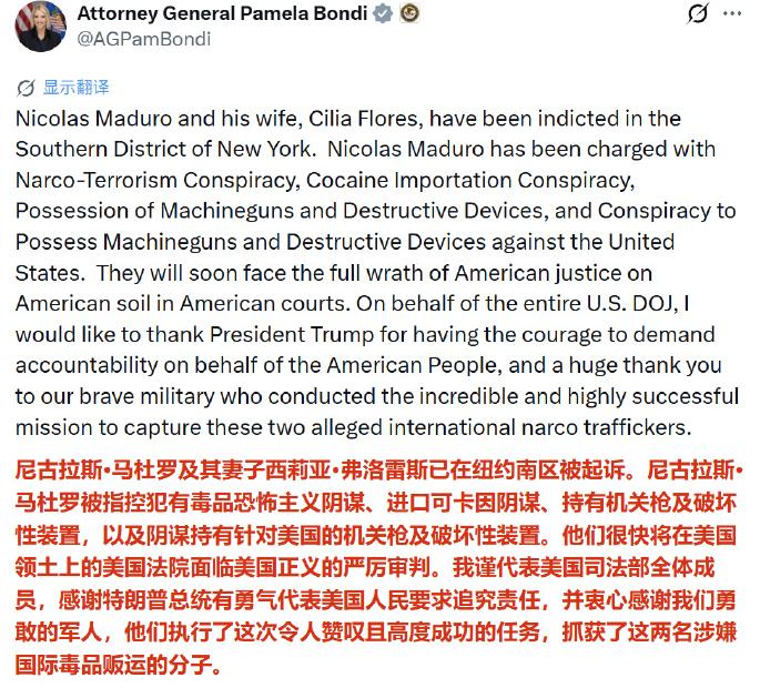 这马杜罗人还没见着呢,美国就已经迫不及待要开堂审理了,美国司法部长邦迪通过社交媒体发布消息:马杜罗及其夫人已在美国纽约南区联邦地区法院被起诉,罪名除了已知的毒品问题等,其中最诡异的一条罪名是“持有机枪及破坏性装置罪”。 真是欲加之罪何患无辞,什么罪名都往上凑,正常一个国家的国防力量武器装备威胁到美国,也能成为罪名,按这个标准岂不是美国可以随便起诉世界上的任何一个国家。