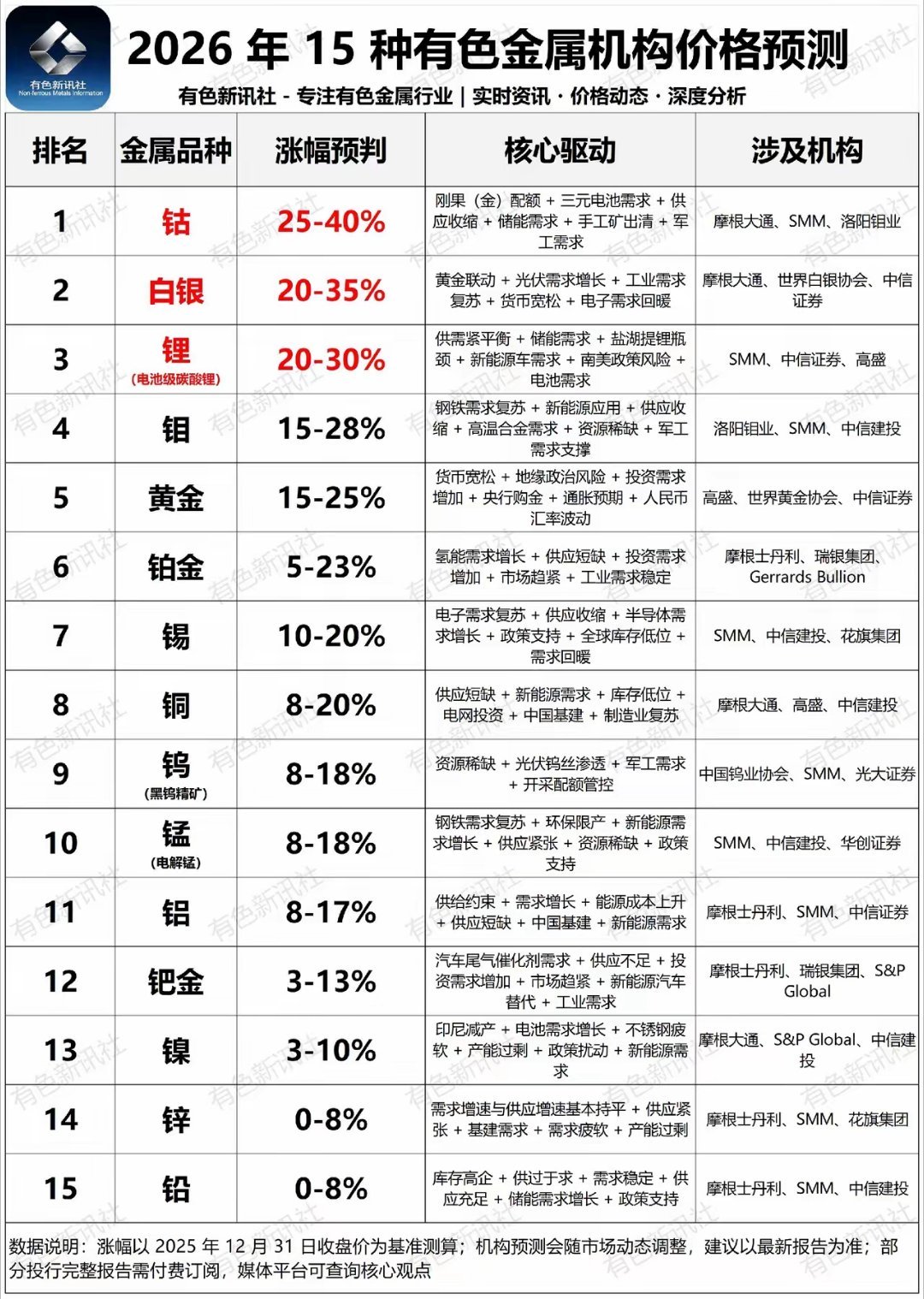 2026年15种金属涨幅预测榜单2026年15种金属涨幅预测榜单还在为明年的投资方向发愁吗?这张图为你梳理了15种核心金属在2026年的机构价格预测。钴因资源稀缺与储能需求被普遍看好,白银、锂紧随其后,预计涨幅均超20%。榜单不仅呈现了从贵金属到工业金属的完整涨幅排序,更揭示了每类金属背后的核心驱动逻辑与权威机构观点。无论你是关注新能源赛道、传统基建复苏,还是全球宏观配置,这份基于多家投行与行业机构研判的预测合集,都将为你的2026年投资布局提供一份有价值的参考地图财经观察官