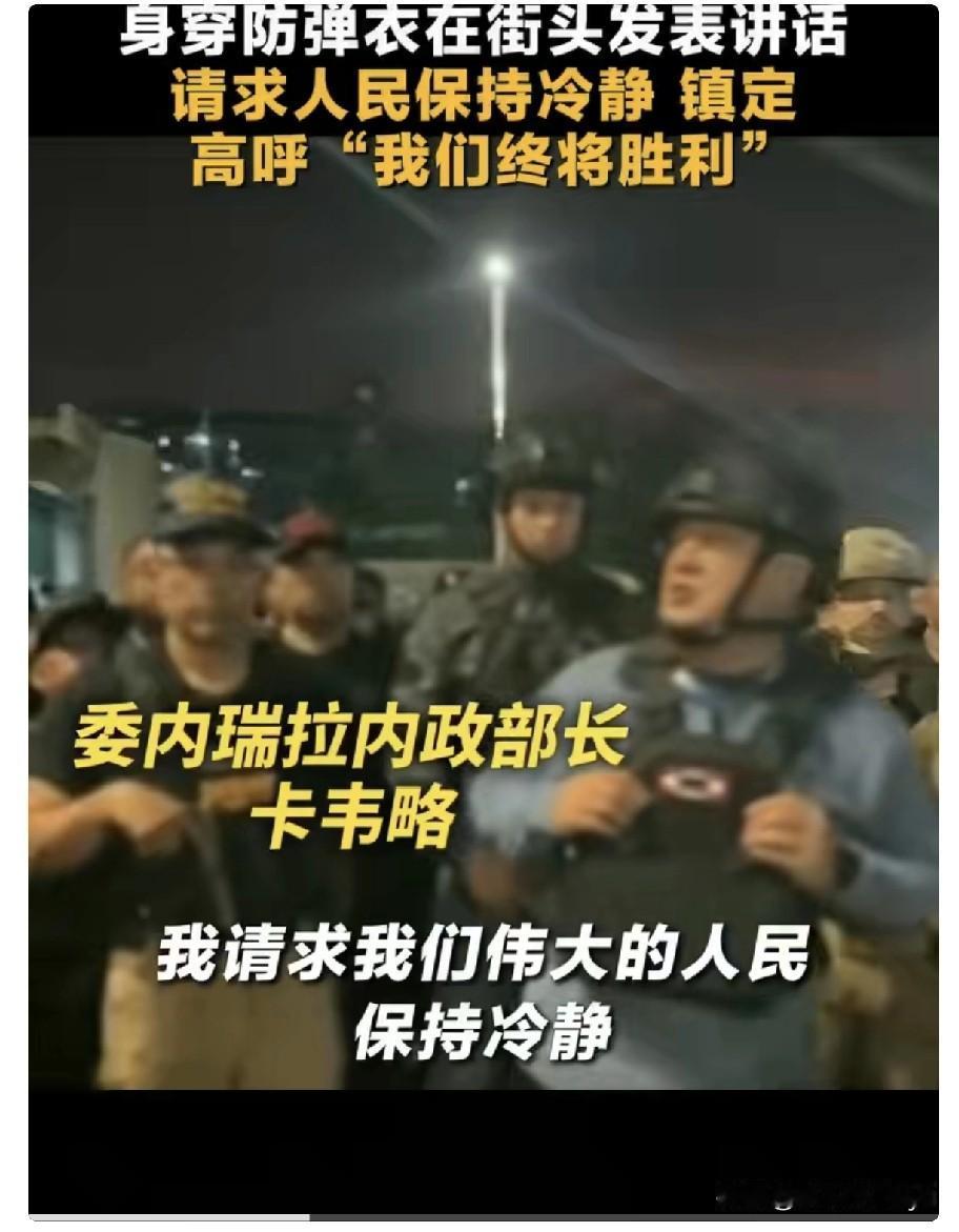 委内瑞拉内政部长卡韦略身穿防弹衣在街头发表讲话—— “我们请求我们伟大的人民保持冷静,相信我们的领导层,相信我们的军政领导人。任何都不应该陷入绝望,不要让入侵我们的敌人有机可乘。 这场袭击过后,我们终将取得胜利,愿我们的国家赢得胜利”。 委内瑞拉在拉美是一个中等国家,它有91万多平方公里的国土面积,2800万人口,常备军多达20万人。就这样被美国轻而易举地掳走了总统,可见其在国家防御、国家管控等存在不少漏洞,这在拉美和加勒比地区国家比较普遍。 内政部长的街头讲话当然是为了稳定人心,鼓舞士气,增强斗志,但国家的治理不是一朝一夕就能提升上去的。就目前的状况,你怎么取得胜利?怎么才算取得胜利!