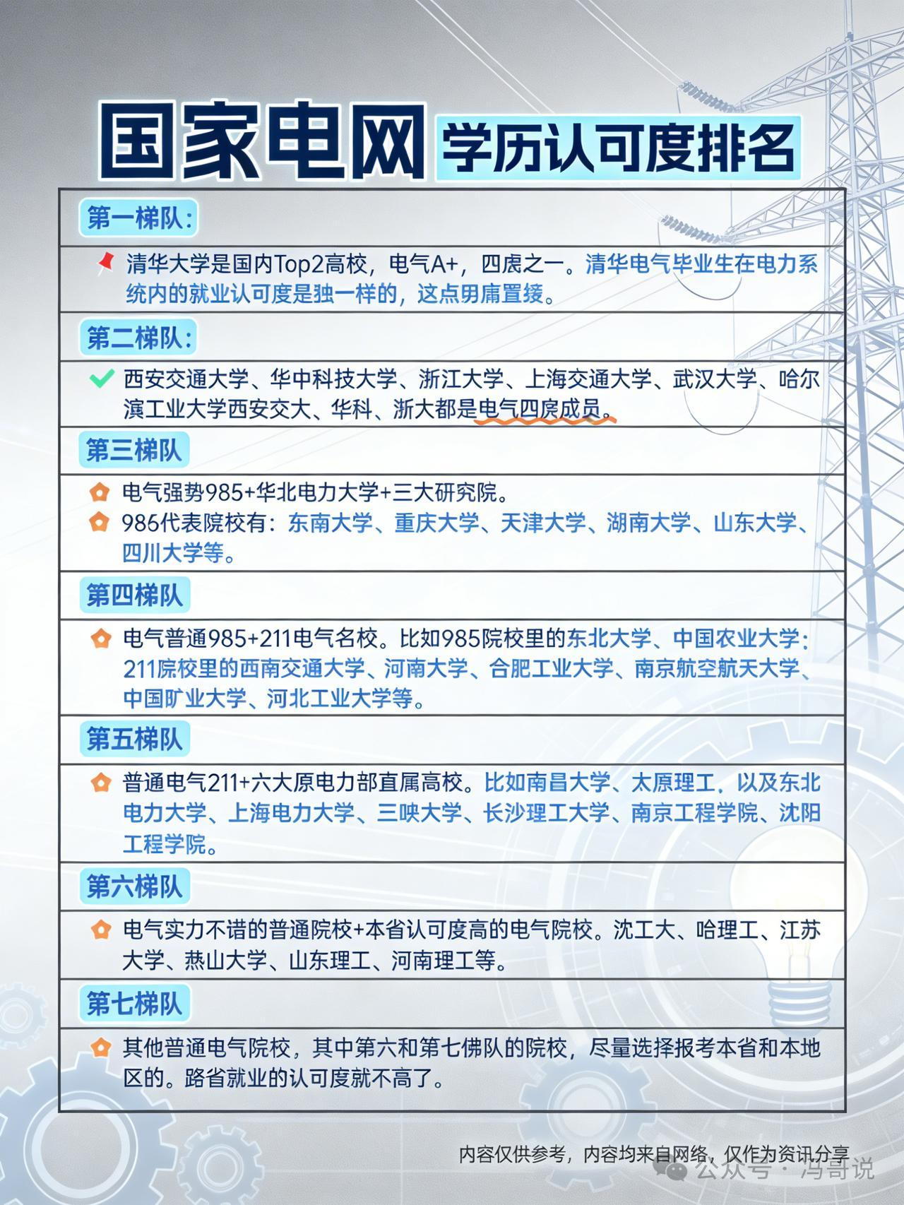 快来看!国家电网学历认可度大排行 快来瞧!国家电网学历认可度排行揭晓。清华 “独一档” 居首,电气学科 A+ 。西交、华科等 “电气四虎” 紧随其后。电气强势 985、华北电力大学等在第三梯队。普通电气 985、211 列四、五梯队。沈工大等普通院校为六、七梯队,@冯哥说升学