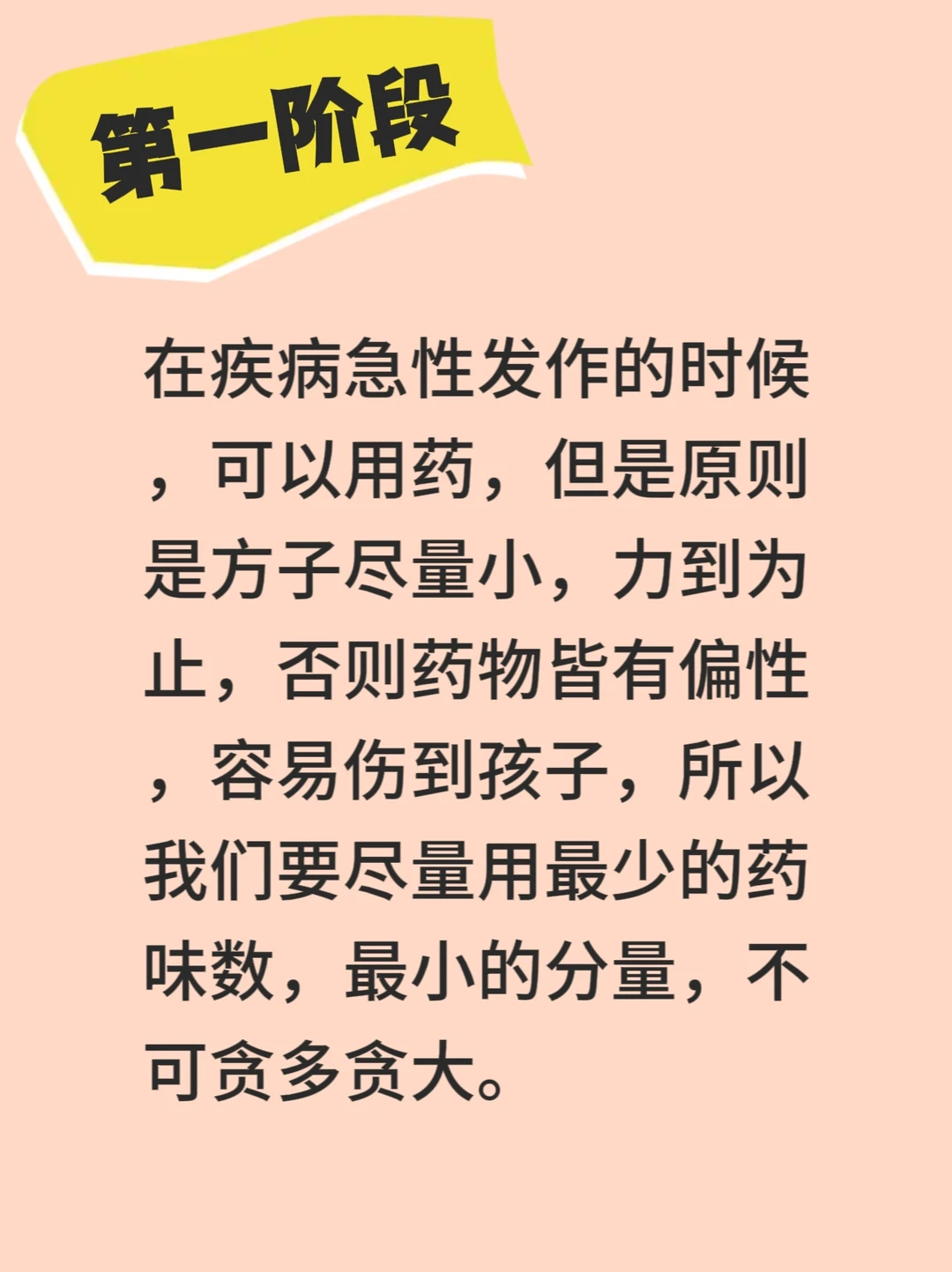 关于小孩子的调理方法,我的观点是,小孩子的身体调理分为两个阶段: [清单R] [一R]第一阶段 在疾病急性发作的时候 ,可以用药,但是原则是方子尽量小,力到为止,否则药物皆有偏性,容易伤到孩子,所以我们要尽量用最少的药味数,最小的分量,不可贪多贪大。 [二R]第二阶段 在疾病的平稳期,尽量采用食疗、推拿、按摩等方式,这样平稳,而且可以在平缓之中,见到日日的改善,这是我最推崇的方式。 [红色心形R] 调养一个孩子,如果按照时间来分配的话,可以说,一百天里,可能只有五六天是在处理急症,服用了药物,剩下的九十几天都是食疗的,都是通过外治或者锻炼的方式来调理的。