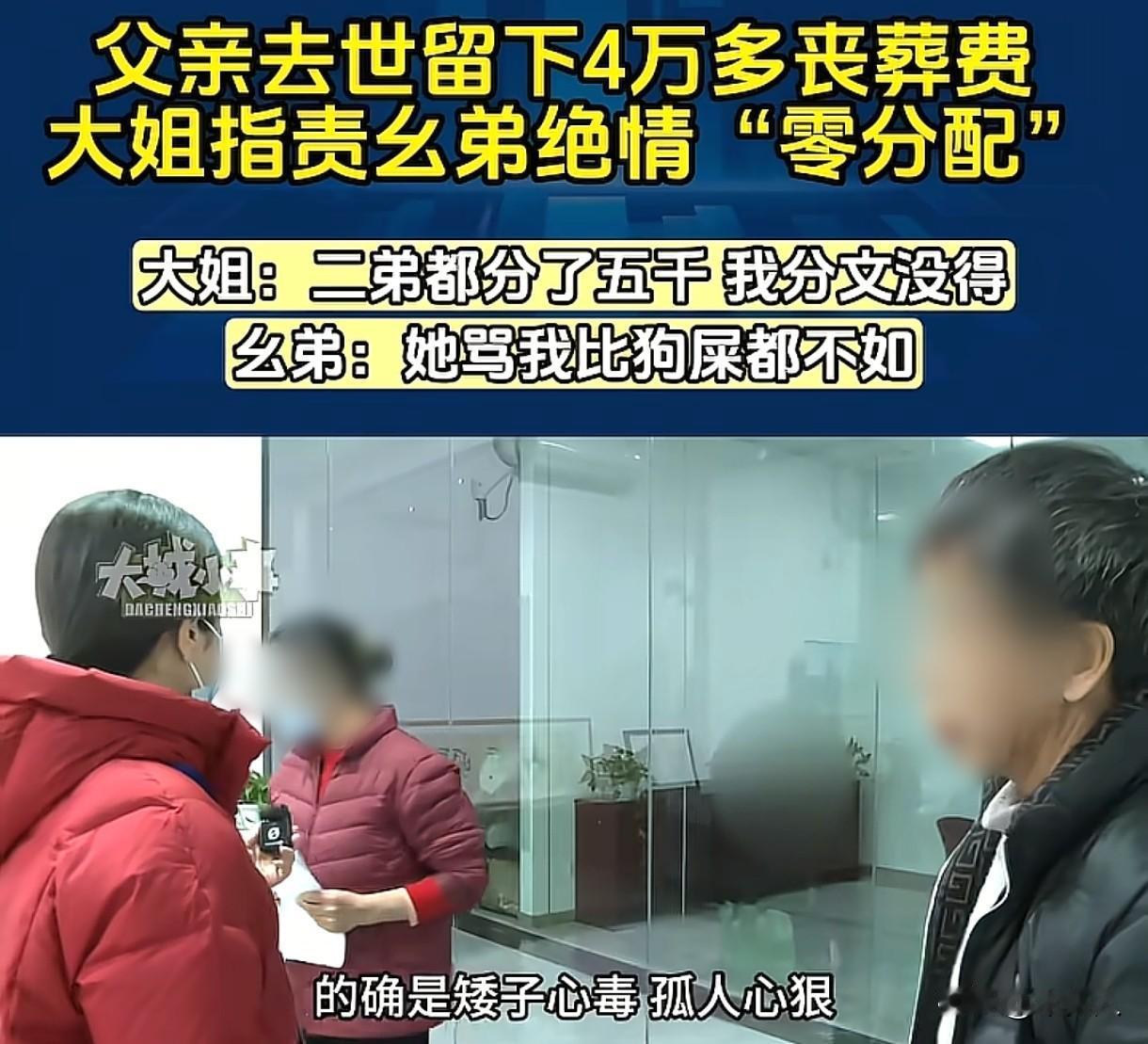 重庆,女子说父亲去世后,留下4万多丧葬费全部在小弟手里,小弟分了5000元给老二,可自己一分都没有,她要求弟弟也给她5000元。可小弟却说:父亲在自己家5、6年,住院8次,姐姐没来看过一次,还骂自己,父亲去世,姐姐还说父亲是被自己毒死的,不让出去,她想拿钱,没那么简单。 2025年10月4日,冯大姐的父亲去世,留下了一笔4万多的丧葬费,这些钱全部被小弟拿走了。 冯大姐得知小弟分了5000元给老二,而自己却分文未得,憋屈坏了。 她觉得小弟就是欺善怕恶,老二脾气火爆,小弟怕挨打才乖乖给钱,自己善良本分,反倒被弟弟欺负了。 越想越气的她,找来调解员,想要为自己讨回公道,要求小弟也给她5000元。 双方一见面,姐弟之间就有些剑拔弩张。 小弟表示姐姐想拿钱,没那么简单,姐姐把自己骂的连个外人都不如,连猪狗都不如。 父亲去世,姐姐居然说父亲是被他毒s的,不让老人出去,双方还闹到了派出所。 可冯大姐却说自己没骂弟弟,还让调解员问老二。 老二表示大姐确实骂了几句,但是具体内容他不记得了,但是兄弟姐妹之间没必要这么计较。 调解员问冯大姐:“老人去世后,为啥不让小弟处理后事呢?” 冯大姐解释说:老人的遗产,弟弟多少得分自己一点,弟弟没给,双方这才闹上了。 她的情绪越来越激动,竟在现场骂起了弟弟:“矮子心毒,孤人心狠!” 老二见气氛愈发紧张,打圆场:大姐就是想从老人遗产里留个念想,给多少都成。 冯大姐趁机再次提出自己的诉求:“你给了老二5000,就得也给我5000!” 小弟一听,顿时火冒三丈,质问她:“你看过老人吗?给老人买过一块饼子吗?老人住院8次,你照顾过他一天吗?” 冯大姐却让弟弟拿出住院手续,还埋怨弟弟,父亲住院,他们没通知她。 小弟媳忍不住开口:“父亲住院的时候,每次都是三姐、二哥的儿子和我丈夫在照顾。” 调解员觉得很奇怪,便问冯大姐:“老人住院这事,你知道不知道?” 冯大姐回答得斩钉截铁:“不知道,从来不知道,根本没人通知我。” 小弟说之前有一次他们通知大姐,结果大姐发了好大的火。 冯大姐却指责弟弟,她只知道父亲住过一次院,自己去看,弟弟却拍桌子打巴掌,态度凶得很。 小弟更气愤了:那是因为大姐骂了自己,父亲在自己这里住了5、6年,大姐从来没有照顾过,自己叫她来看,她还说:‘死都没死,你又把我喊来做什么?” 冯大姐依旧坚持:自己没去,是因为弟弟没喊自己。 小弟媳站出来替丈夫说话:“父亲在我们这儿住了五六年,来看望最多的就是三姐和二哥,大姐和大姐夫一次都没来看过。” 冯大姐这才承认事实确实如此,但强调是因为弟弟弟媳没通知她,她啥都不清楚。 小弟媳反驳道:“不是没通知,是大姐你说自己忙,工作忙没时间。” 听到这话,冯大姐的态度突然来了个一百八十度大转弯,她轻轻扶着弟媳的肩膀,说自己承认弟媳为老人付出了很多功劳,以前的事就翻篇了,老人已经去世了,再吵再闹也没啥意思了。 接着,她解释自己没去看父亲,是因为自己坐不了车,不过每个月都给了赡养费,每个月400元,已经给了一年多了。 小弟却指出大姐还有3个月的钱没给,冯大姐解释自己不会转账,钱都是女儿转的,后来女儿两个孩子要读书,没钱就没给了。 可小弟却说姐姐就是不想拿钱。 冯大姐却说他们都是姊妹,不要去计较这些了,父亲的遗产,弟弟多少得分自己一点。 对于老人的遗产继承,冯大姐作为子女,理应是有继承权的。 但是对老人尽到较多赡养义务的子女,可以适当多分。没尽到义务的,少分或者不分。 《民法典》第1130条规定:对被继承人尽了主要扶养义务或者与被继承人共同生活的继承人,分配遗产时,可以多分。 有扶养能力和有扶养条件的继承人,不尽扶养义务的,分配遗产时,应当不分或者少分。 小弟和老二、老三在父亲生前承担了主要的照顾和赡养责任,而冯大姐虽说每个月给了赡养费,但在父亲住院等关键时候,并没有尽到足够的照顾义务。 小弟和其他家人在分配遗产时,确实可以多分,冯大姐应该少分或者不分。 丧葬费不属于遗产,是在死者死亡后由用人单位、社保机构等支付给其近亲属的费用,用于办理丧葬事宜,‌并非死者生前已拥有的财产‌,因此不符合遗产的构成要件。 分配时一般会考虑当事人与死者生前的亲密程度、是否共同生活等因素,而非严格适用遗产继承规则。‌ 经过调解,小弟说愿意给冯大姐3000元,可冯大姐要求小弟给她3600元。 最终小弟现场转了3600元给冯大姐,双方和解。 兄弟姊妹之间,本应该相互扶持,相互理解。 冯大姐的强硬态度和指责,让小弟满腹委屈和愤怒,双方矛盾激化,看到姐姐态度转变,承认他们的付出,事情才有了缓和。 在亲情与利益面前,多一些理解和包容,站在对方的角度想一想,才能让家庭更加和睦。