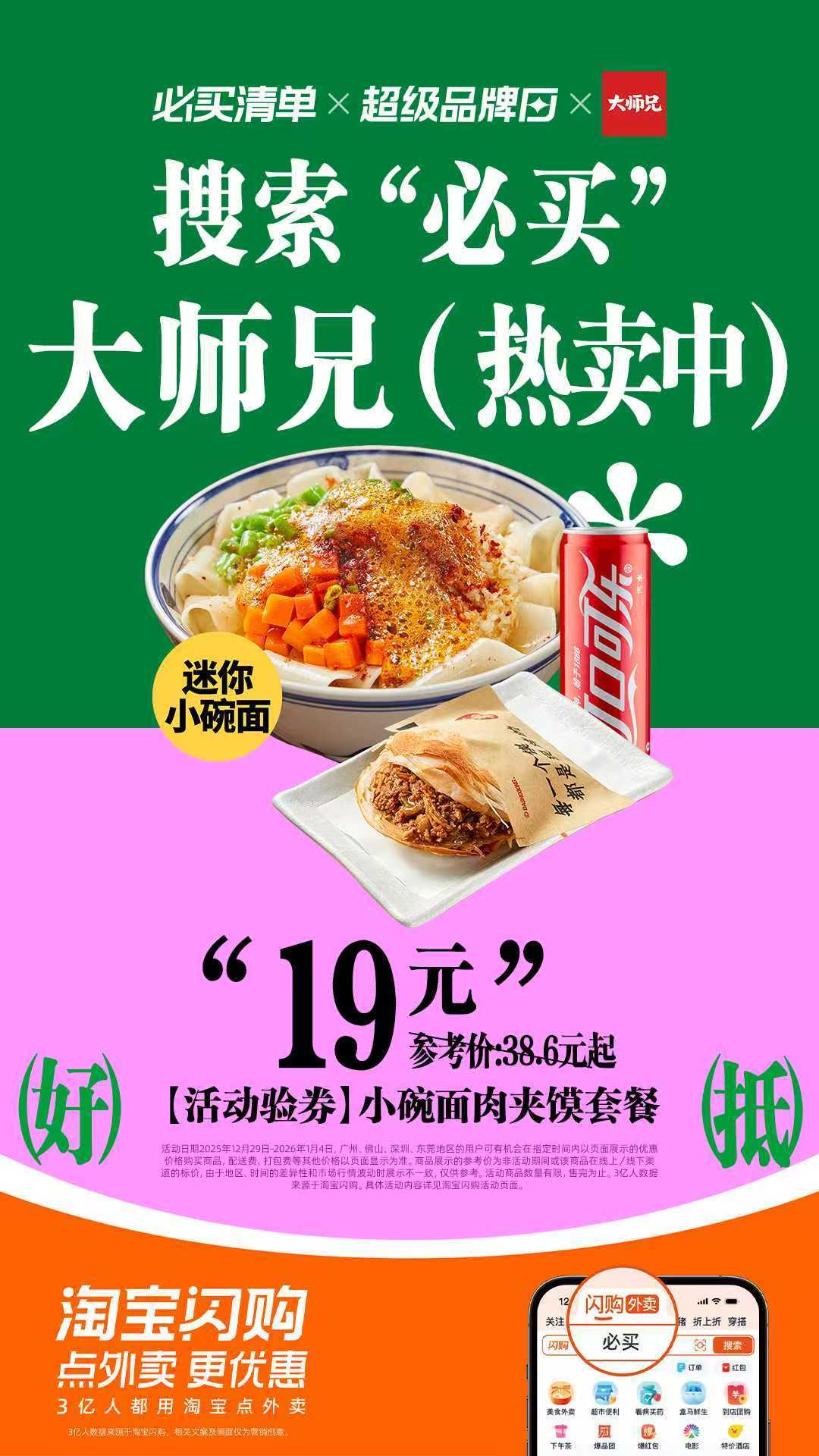 2026开工首日,早餐要够正先有干劲!大师兄小碗面肉夹馍套餐19元起,大师兄凉皮肉夹馍小米粥套餐25.9元起;不必在APP间来回比价,大牌云集、搭配多样,一口价无套路超省心,省下纠结的心思,留给开工第一份报表。1月3-4日,上淘宝闪购搜【必买】,19.9元起享靓价,实付满25元免费抽奖百分百中奖!开工早餐选对款,新一年顺风顺水~