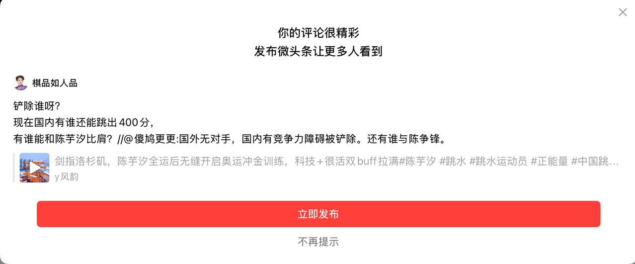 目前,在国内女子10米台领域, 陈芋汐在"稳定输出400以上" 这个维度上, 是独一档的存在, 有谁能和陈芋汐比肩?//@傻鸠更更:国外无对手,国内有竞争力障碍被铲除。还有谁与陈争锋。