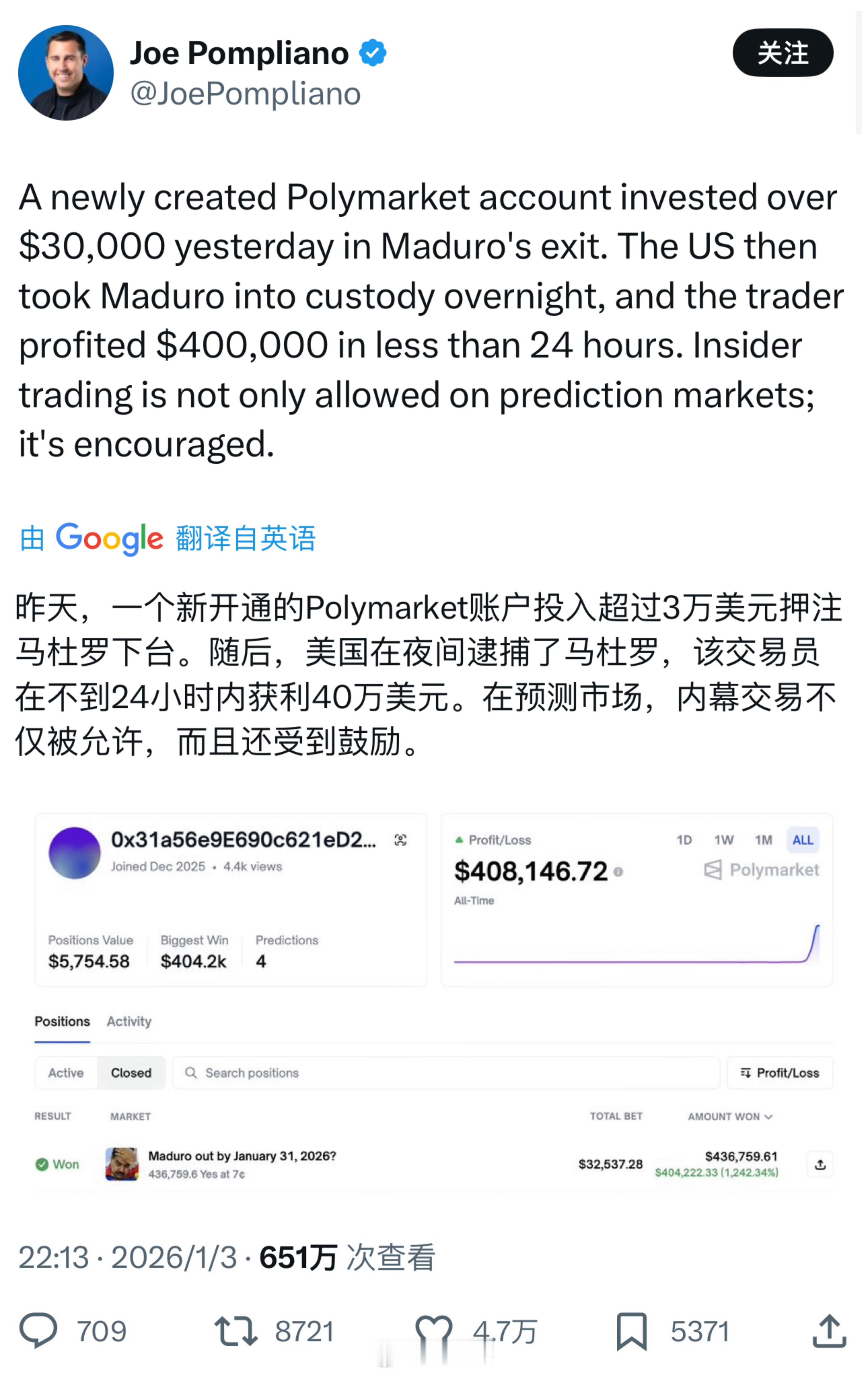 美国人发现,昨天有个新开的小号在菠菜网站上下注3万美元押“委内瑞拉马杜罗1月31日前下台”,一天之内赚了40万美元