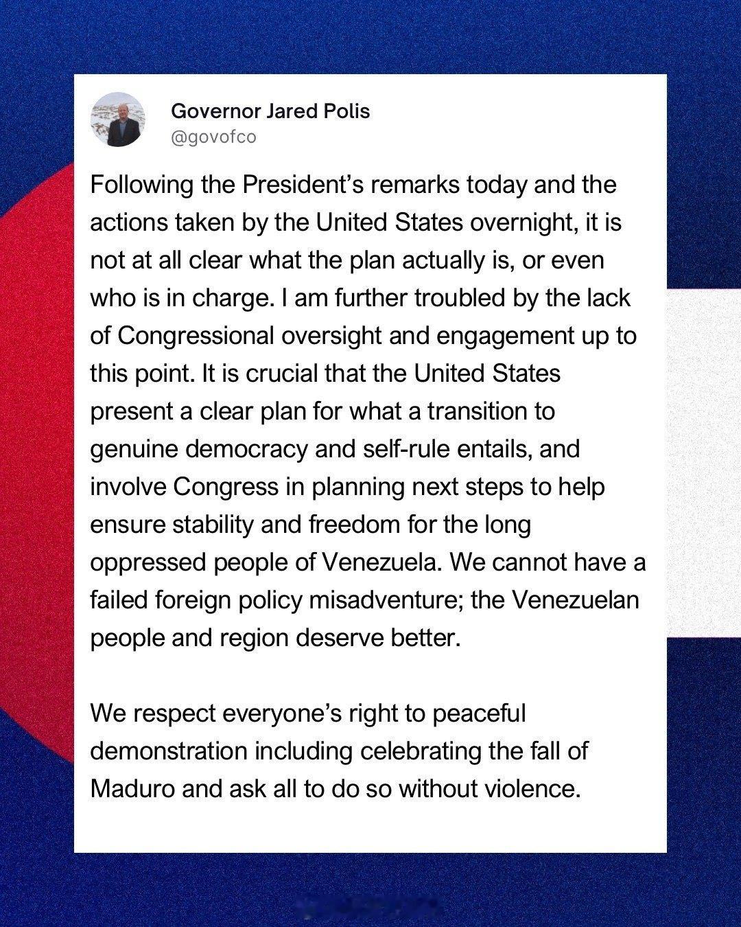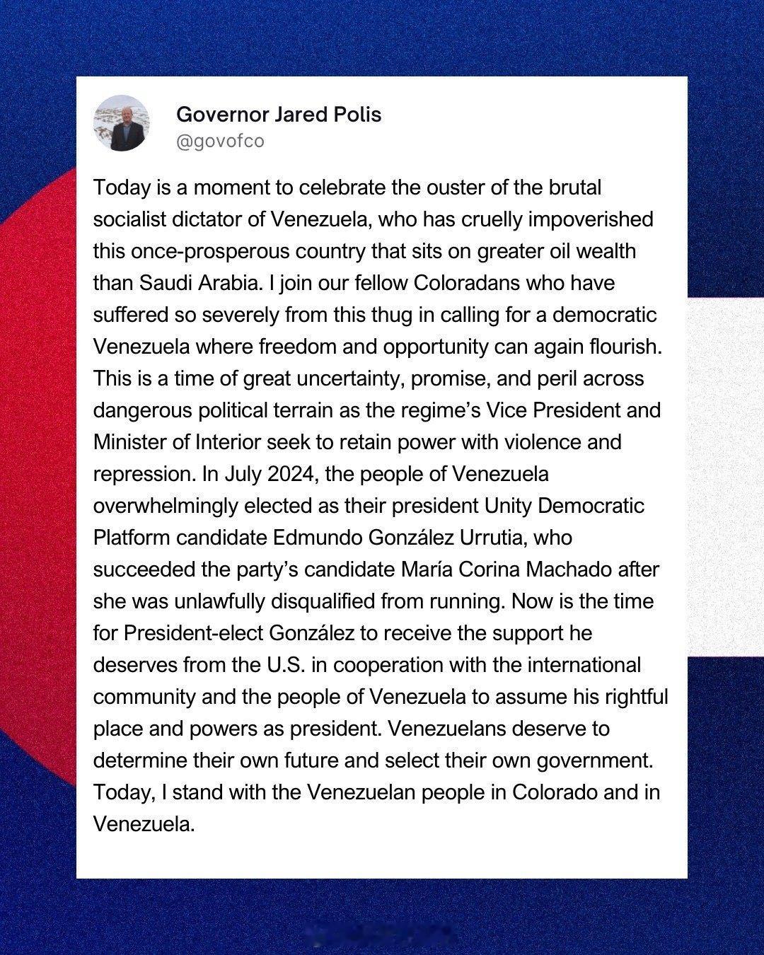 被特朗普总统多次公开辱骂的科罗拉多州民主党州长波利斯发表声明:第一:今天是庆祝推翻委内瑞拉残暴社会主义独裁者的时刻,这个独裁者残酷地使这个曾经繁荣、拥有比沙特阿拉伯更多石油财富的国家陷入贫困。我与深受这个暴徒伤害的科罗拉多同胞们一起,呼吁建立一个民主的委内瑞拉,让自由和机会再次繁荣。这是一个充满巨大不确定性、希望和危险的政治险境时期,该政权副总统兼内政部长正试图通过暴力和镇压维持权力。2024年7月,委内瑞拉人民以压倒性多数选举统一民主平台候选人埃德蒙多·冈萨雷斯·乌鲁蒂亚(Edmundo González Urrutia)为总统,他是在玛丽亚·科里纳·马查多(María Corina Machado)被非法取消参选资格后接替该党候选人的。现在是时候让当选总统冈萨雷斯获得他应得的美国支持,与国际社会和委内瑞拉人民合作,让他就任其正当的总统职位和权力。委内瑞拉人民有权决定自己的未来并选择自己的政府。今天,我与科罗拉多的委内瑞拉人民以及委内瑞拉本土的人民站在一起。第二:在总统今天的讲话以及美国昨夜采取的行动之后,目前尚不清楚实际计划是什么,甚至谁在负责。我对迄今为止缺乏国会的监督和参与感到进一步困扰。美国必须提出清晰的计划,说明向真正民主和自治的过渡意味着什么,并让国会参与规划下一步行动,以帮助确保被长期压迫的委内瑞拉人民的稳定与自由。我们不能重蹈失败的外交政策冒险覆辙;委内瑞拉人民和整个地区值得更好的待遇。我们尊重每个人和平示威的权利,包括庆祝马杜罗倒台,并要求所有人以非暴力方式进行。