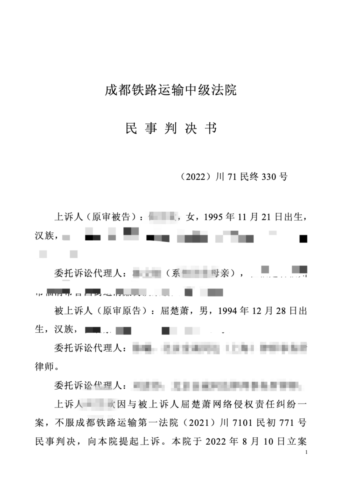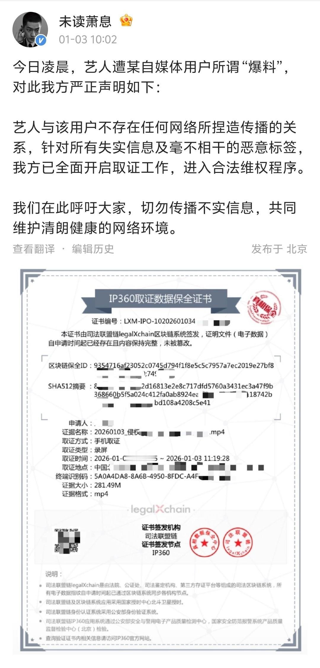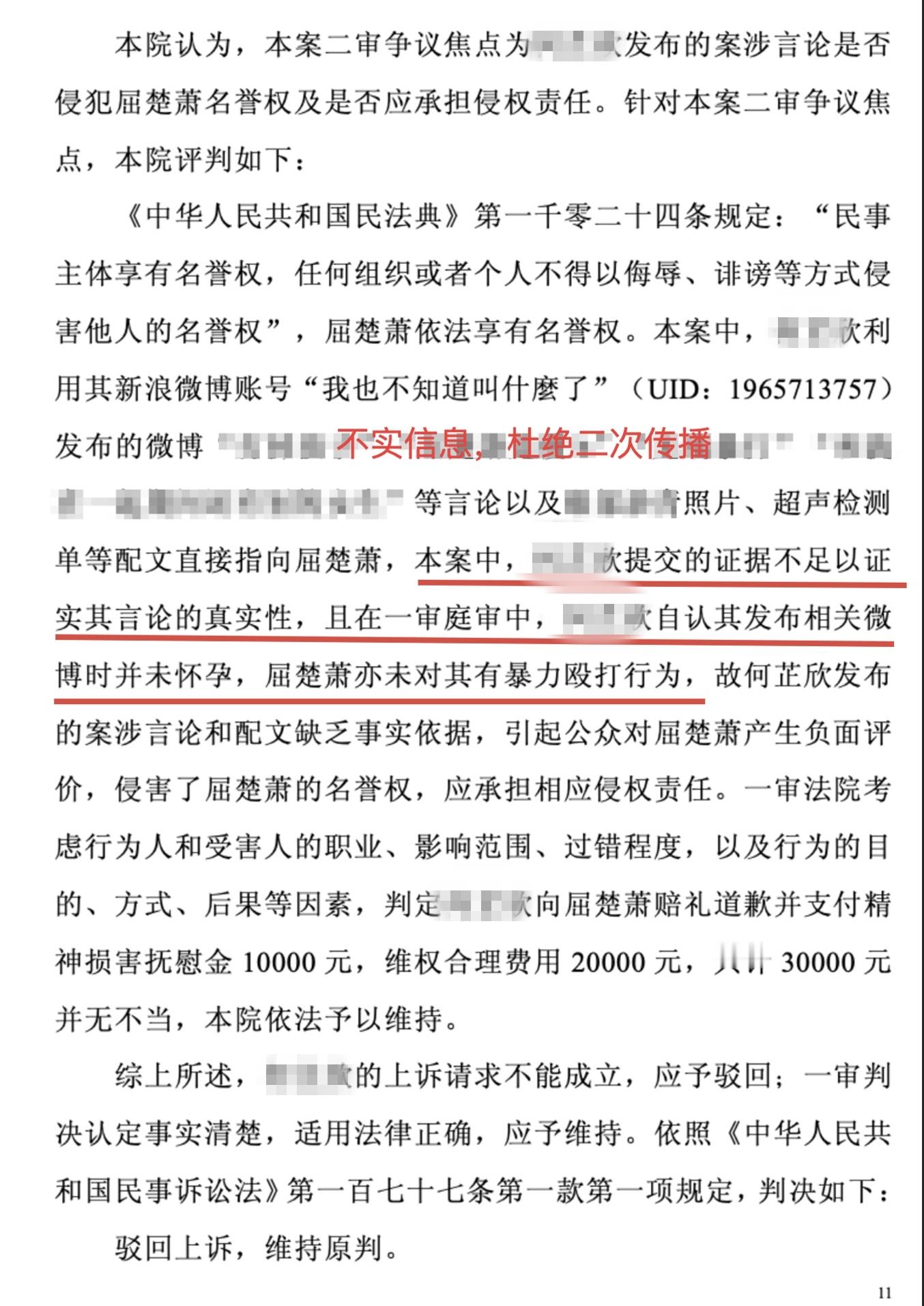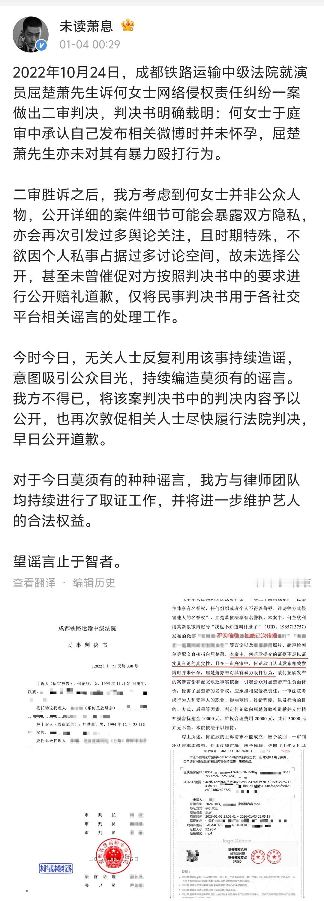 【屈楚萧方晒二审判决书】1月4日凌晨,工作室发长文再回应此前被曝家暴一事,并公开2022年10月24日的二审判决书,裁判书中提到,上诉人于庭审中承认自己发布相关微博时并未怀孕,屈楚萧亦未对其有暴力殴打行为,但当时因考虑到对方并非公众人物,所以未选择公开,“对于今日莫须有的种种谣言,我方与律师团队均持续进行了取证工作,并将进一步维护艺人的合法权益。”屈楚萧方公开胜诉判决书