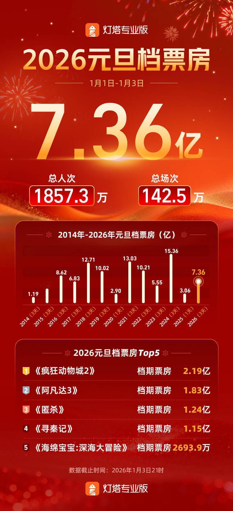 【2026元旦档总票房7.36亿】疯狂动物城2成元旦档票房冠军 据灯塔专业版,截至1月3日21时,2026年元旦档(1月1日-1月3日)票房7.36亿,《疯狂动物城2》获得2026元旦档票房冠军,并即将超越《复仇者联盟4:终局之战》登顶中国影史进口片冠军榜。档期内票房前五的电影为《疯狂动物城2》《阿凡达3》《匿杀》《寻秦记》《海绵宝宝:深海大冒险》这个假期,你去看电影了吗?