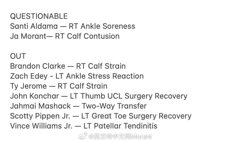 明日灰熊vs湖人 二番战,莫兰特和二大妈都是出战成疑,其中莫兰特是右小腿挫伤!莫兰特热爱篮不住