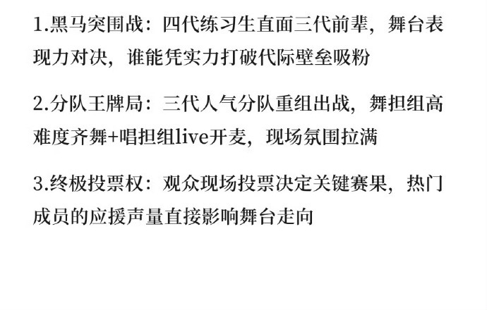 TF家族荣耀之战:三代TOP出道组、三代TFING及四代练习生将参与集体打歌、Vocal/Rap/Dance专项PK及跨代组队对抗,赛果将影响三代重组与四代出道名额。 TF荣耀之战 TF荣耀之战将集体打歌