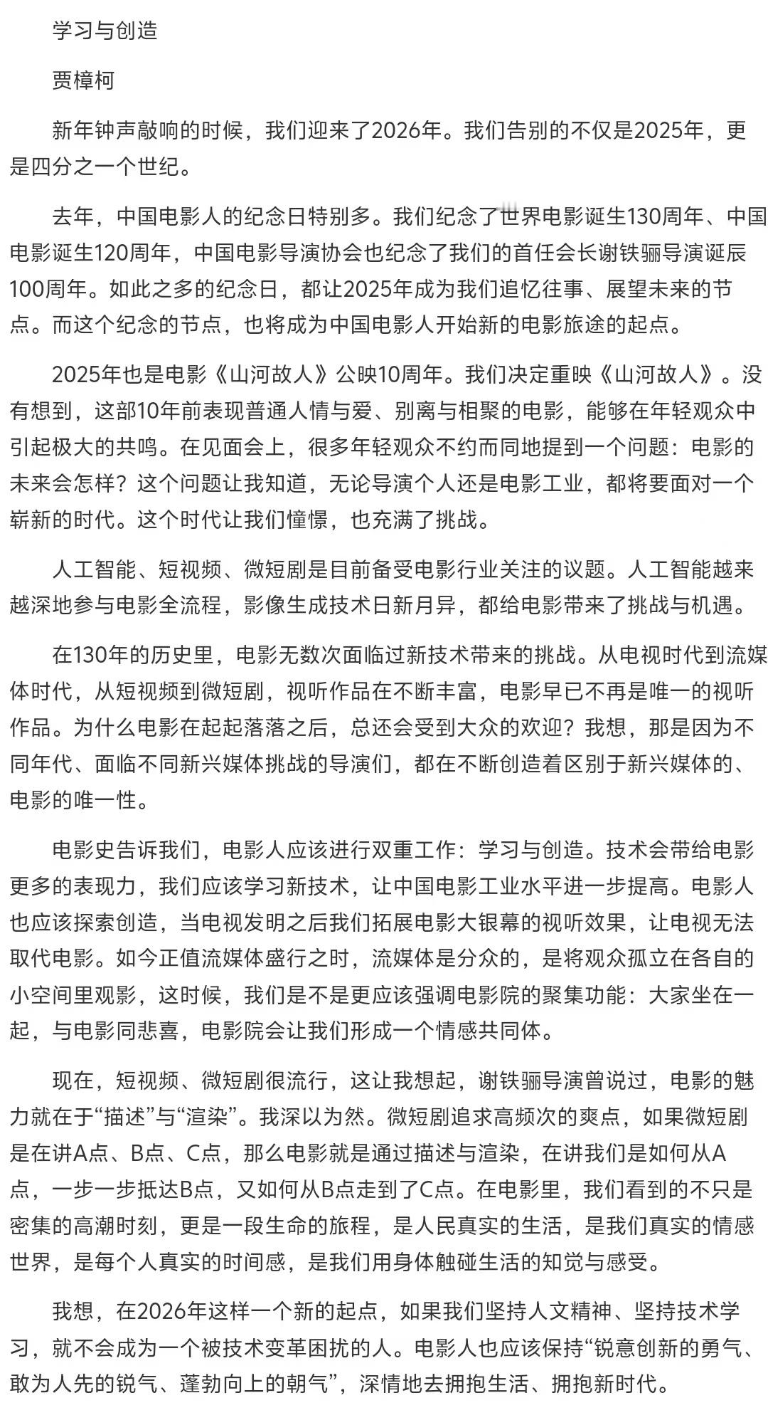 【贾樟柯说电影人要有勇气锐气朝气】“这个时代让我们憧憬,也充满了挑战。”元旦假期,导演在人民日报发文,谈到人工智能与日新月异的影像生成技术给电影带来的挑战和机遇:“如果微短剧是在讲A点、B点、C点,那么电影就是通过描述与渲染,在讲我们是如何从A点,一步一步抵达B点,又如何从B点走到了C点。”他说,在2026年的新起点,电影人也应该保持“锐意创新的勇气、敢为人先的锐气、蓬勃向上的朝气”,深情地去拥抱生活、拥抱新时代。