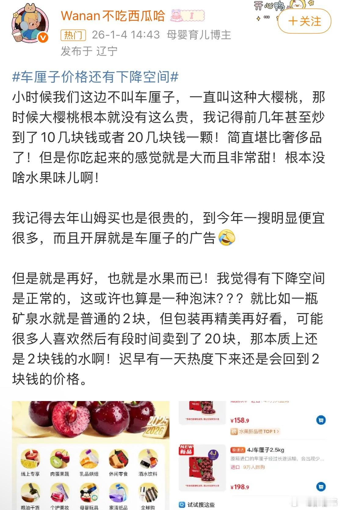 想吃车厘子的可以再等等,还有下降的空间呢现在的供过于求,供货商着急卖给大家呢,现在好多消费者都不为高价水果买单了,比如说国内的樱桃也好吃,价格好便宜最近半个月明显感觉到有营销号再营销车厘子降价了、车厘子是血糖友好型水果、车厘子含褪黑素助入睡,感觉都是商家的套路啊,生怕大家不买其实现在便宜了还是几十一斤,前两天刚买了JJ的还要30一斤呢,何必凑热闹呢一句话,商家越着急卖,说明车厘子价格还有下降的空间,想吃的可以再等等车厘子价格还有下降空间车厘子价格还有下降空间