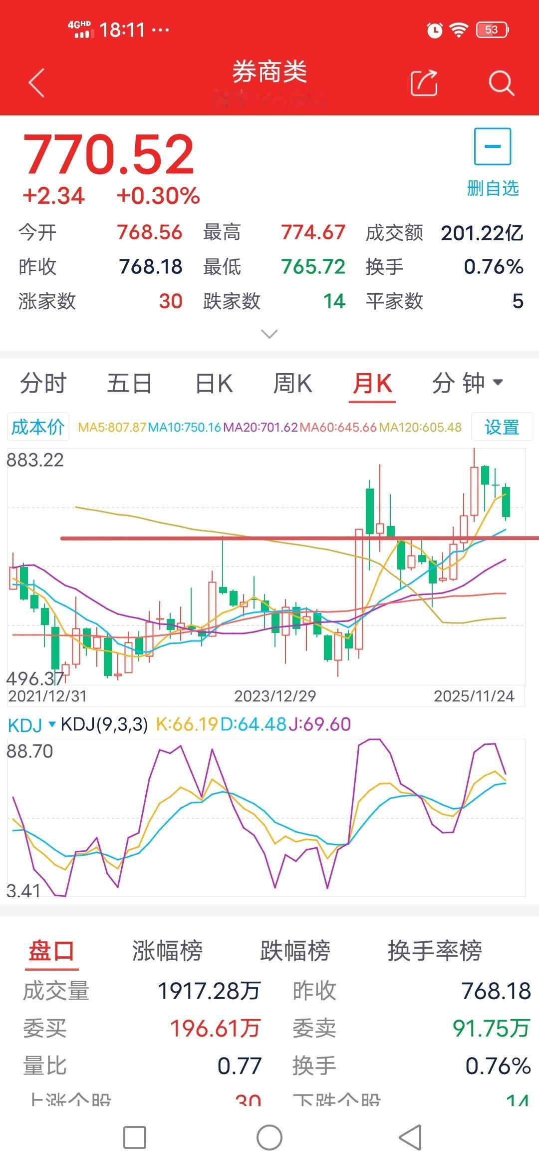盘中再度创出调整新低,11月25日券商板块将如何演绎? 今日盘中,券商板块创下调整以来的新低点765点,随后反抽至774点,最终收于770点,此点位亦是此前提及的周线级别高点。 后续走势分为两种情形。其一,继续向上反抽至781点,或是触及5日线与120日线,而后向下调整以寻求支撑;其二,直接向下调整,跌至5月线750点或前期高点740点,再向上震荡,于780点与740点之间进行横盘震荡,最后抉择方向。