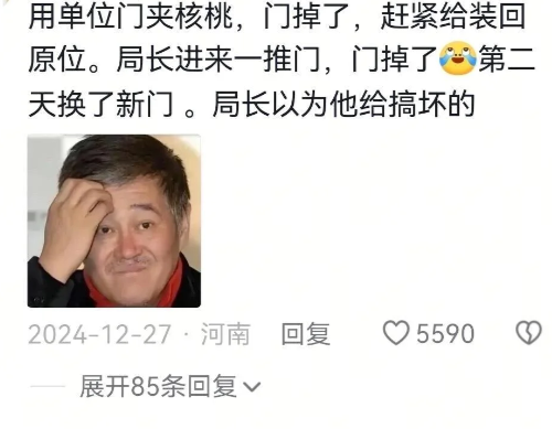 用单位门夹核桃,门掉了,赶紧给装回原位。局长进来一推门,门掉了第二天换了新门。局长以为他给搞坏的