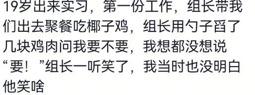 19岁出来实习,第一份工作,组长带我们出去聚餐吃椰子鸡,组长用勺子舀了几块鸡肉问我要不要,我想都没想说"要!"组长一听笑了,我当时也没明白他笑啥