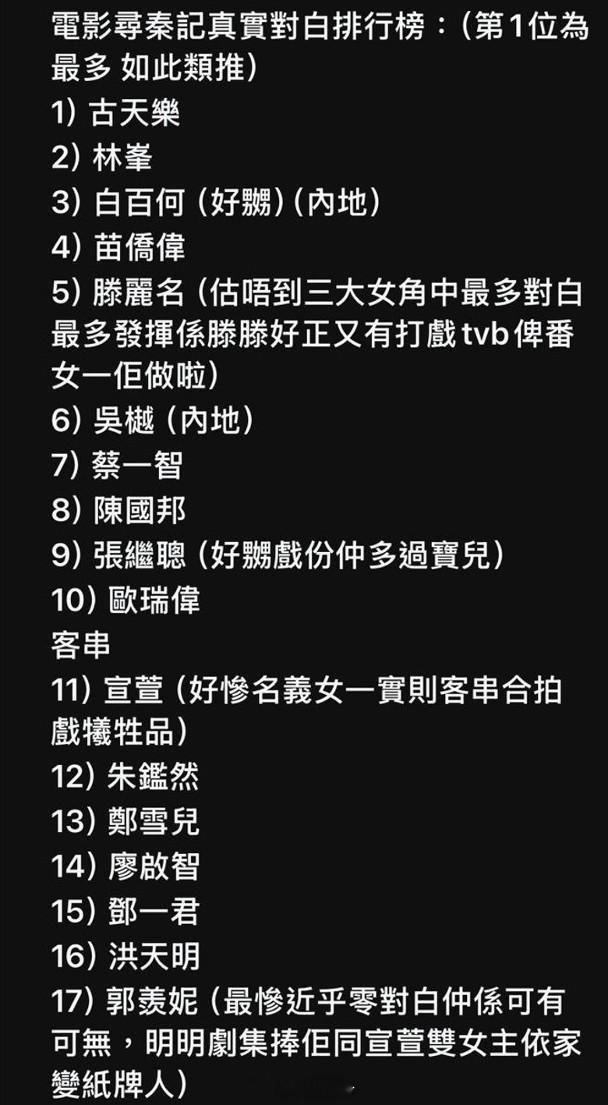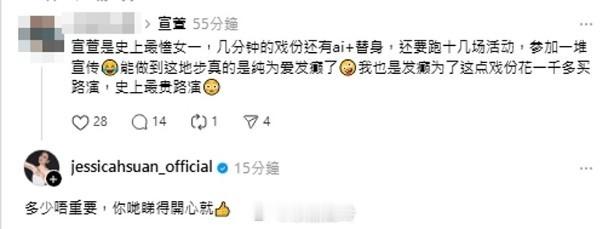 【On.cc】與佘詩曼爭視后!宣萱覆網民講明「不會」出席台慶頒獎禮台慶頒獎禮今晚(4日)舉行,視后10強名單中,佘詩曼憑《新聞女王2》再爭視后,力戰在《巨塔之后》飾演心臟外科醫生的宣萱,兩大熱門爭崩頭。宣萱最近因《尋秦記》聲勢人氣急升,有網民指她跟阿佘有力一戰。今日有網民出Po,Tag了宣萱問:「董醫生今天會不會出席在TVB的頒獎典禮呢?好想看到你哦?!」宣萱即回:「不會!」過往無綫「到才有獎」慣例,莫非阿佘真的創造歷史,4奪視后?網民紛紛回應:「懸念都破壞啦」、「So sad!我的女主角不去」、「那今年的視后還是佘詩曼」、「機會大,如果她有去。」宣萱講明唔去台慶頒獎禮。咁仲有邊個阻到阿佘4奪視后?其實古天樂早前宣傳《尋秦記》時,都乘機為宣萱視后拉票,不過,宣萱最後決定不出席!宣萱於上次奪TVB視后,已經是1999年憑《刑事偵緝檔案IV》封后,宣萱日前宣傳《尋秦記》曾被問角逐視后,她在訪問表示:「唔介意再攞多次,攞到會好開心,但我拍劇從來唔係為攞獎,只係想嘗試多啲唔同挑戰。」另外,有網民統計《尋秦記》真實對白排行榜,古天樂第1,林峯第2,白百何第3,滕麗名都排第5,可是身為女一的宣萱排11,對此有網民留言:「宣萱是史上最慘女一,幾分鐘的戲份還有ai+替身,還要跑十幾場活動,參加一堆宣傳😂能做到這地步真的是純為愛發癲了🤪我也是發癲為了這點戲份花一千多買路演,史上最貴路演!」不過宣萱十分大方,並留言:「多少唔重要,你哋睇得開心就!」網民即大讚她睇得開!有網民戥宣萱《尋秦記》對白少不值。有網民統計《尋秦記》對白排行榜。另外,《尋秦記》將於本月9日在台灣上映,古天樂相隔12年再度到台灣宣傳電影,亦是與宣萱繼25年前一同到台宣傳港劇版後,再次一同赴台造勢。古天樂與宣萱會於1月8日到台灣,進行兩日一夜的宣傳活動,除了出席首映會,在8日和9日都會舉辦映後見面會,特別抽出時間和粉絲近距離互動。宣萱