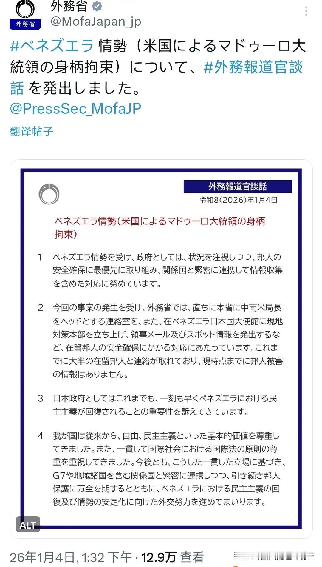 憋了一天,日本终于对马杜罗发声,开口让人很意外 1月4日,在G7国家都做出表态之后,日本政府憋了一天,终于对委内瑞拉事件发声了,一开口让人感觉到非常意外,这到底是怎么回事呢?让我们一起来解读一下日本的这份声明 1、日本政府表示高度关注委内瑞拉事件的进展,并将会确保日本侨民的安全,目前未收到日本侨民受伤的相关消息 2、日本呼吁委内瑞拉民主得到恢复 3、日本将和G7国家紧密协作,为恢复委内瑞拉的局势稳定而努力。 怎么说呢?日本的回应低调谨慎,没有对特朗普和美国进行批评,其主要原因,是因为日本在拉美国家拥有大部分的利益,如果跟美国人穿一条裤子,势必会引发拉美国家的不悦,那些投资也有可能会大了水漂,所以墨迹了一天,才有了这一份不咸不淡的声明
