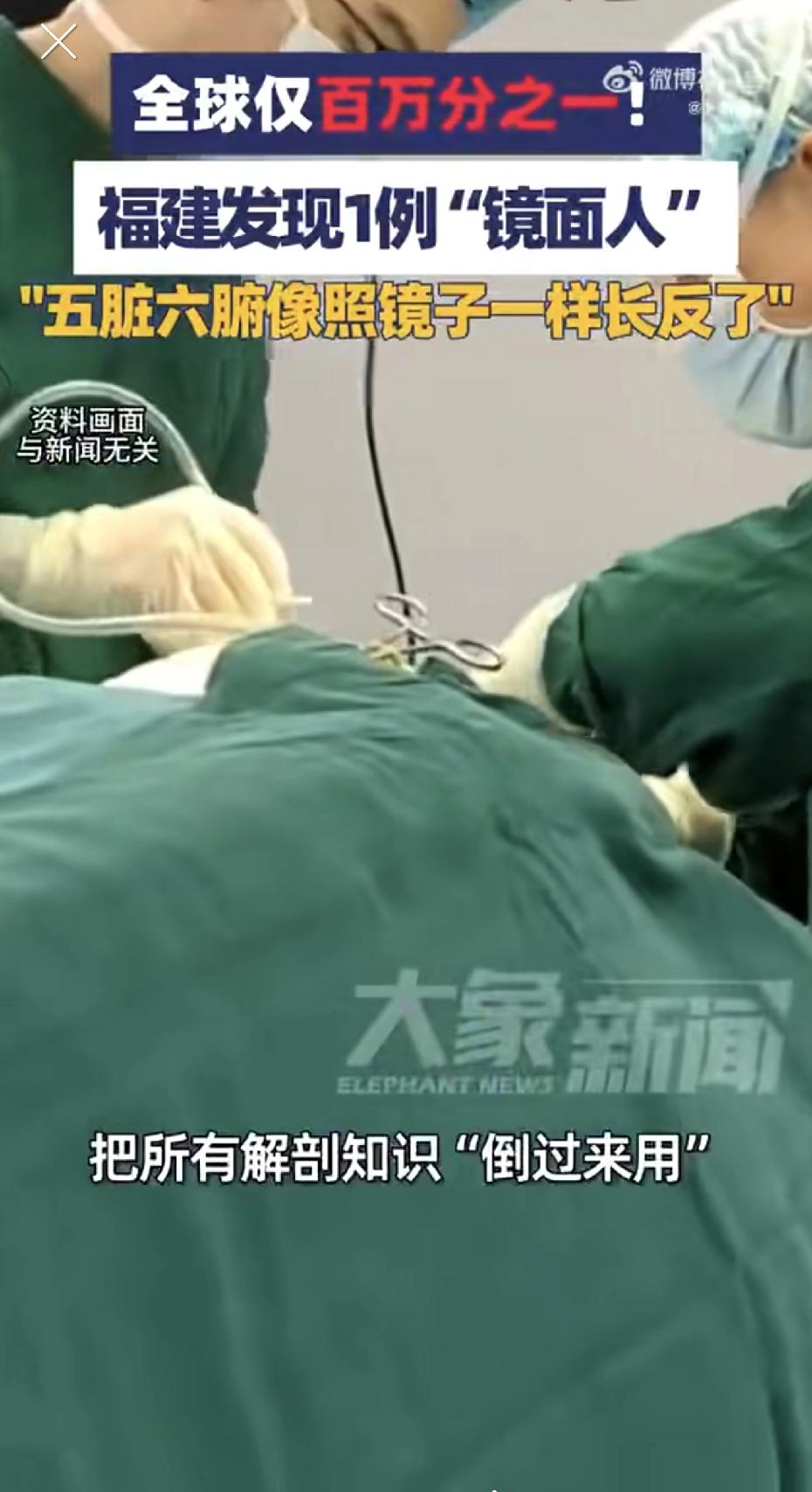 万万没想到!福建一男子肚子疼去医院,查出来是胆结石,稀奇的是医生一检查,发现他是个镜面人! (最近福建有个男子,因为肚子疼去医院,结果查出来胆总管里有结石。 这病不算稀奇,稀奇的是医生一检查,发现他是个 “镜面人”——心脏长在右边,肝长在左边,脾脏长在右边,所有内脏的位置都和正常人完全相反。 这种情况,医学上叫 “全内脏反位”,发生率只有百万分之一左右。简单点来说,就是老天爷把他身体里的“家具布局”完全镜像翻转了。 肚子疼得厉害,结石必须得取。 但这手术可难倒了医生。你能想象吗? 医生十几二十年学到的、练熟的所有解剖知识和手术操作,在这台手术里全部要“倒过来用”。 平时闭着眼睛都知道往哪边下刀、往哪边分离,现在每一步都得在脑子里先翻个面,就像习惯用右手写字的人,被要求必须用左手写出同样精准漂亮的字,而且还是在一个性命攸关的场合。 手术台变成了一个“镜像世界”。平时做这种胆管手术,器械顺着身体结构就进去了,这回得“反着来”,连医生的站位、手势都得调整。 手术团队花了两个多小时,在逆向思维下精准操作,才成功把结石取了出来。一周后,男子康复出院,这例罕见的手术也画上了圆满的句号。 我觉得吧,当个“镜面人”自己平时可能没感觉,但生病的时候可真麻烦啊。 想想看,他这辈子每次体检或者看病,估计都得特意跟医生说一句:“那个,我心脏在右边啊。” 不然,医生听诊器往左边一放,可能吓一跳。 有资料说,这种全反位的人,器官功能基本正常,寿命也和普通人没差。可一旦需要动刀子,就把难题全抛给了医生。 不得不好奇的问一句,你们都听说过这种镜面人吗?