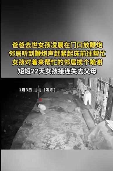 看哭!湖南女孩22天痛失双亲,深夜放鞭炮报丧,邻居闻声全赶来,磕头跪谢戳碎全网心 (个人观点仅供参考,无任何不良引导) 真的被狠狠戳中泪点!湖南一名女孩,短短22天里父母接连离世,一夜之间成了孤身一人,扛起了天塌下来的苦难,画面揪心到让人不忍看。 父亲离世的深夜,女孩强忍着剜心的悲痛,独自守在门口,按照当地习俗点燃鞭炮报丧。寂静深夜里,噼里啪啦的鞭炮声格外刺耳,那是她对父亲的最后告别,更是绝望时无助的求救。 没想到,邻居们听到鞭炮声,不问缘由全都自发赶来,没有一人迟疑推脱,主动帮女孩张罗后事,搭棚子、理杂事、跑前跑后操持一切,全程毫无怨言,用最朴实的行动,为女孩撑起了一片遮风挡雨的天。 女孩看着满院热心相助的邻居,满心感激,对着每一位帮忙的人,郑重逐一磕头跪谢,额头触地的那一刻,满是心酸与感恩,这一幕被拍下后,瞬间看哭无数网友,全网满是心疼。 22天痛失双亲,本是人生至暗绝境,却因这份淳朴的邻里情,让女孩感受到世间最真切的温暖。没有华丽的言语,只有实打实的帮扶,远亲不如近邻,此刻体现得淋漓尽致。 网友纷纷感慨,这份邻里情太珍贵,足以治愈世间所有的凉薄,这才是人间最动人的温情。 这样的暖心邻里,是不是世间最美的风景?