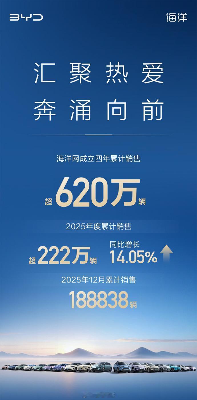 比亚迪的2025全年销量数据来了!全年累计销售 4602436 辆,拿下全球新能源市场销量冠军。-比亚迪海洋网 与比亚迪王朝 合计贡献 407.52 万辆,占总销量超 88.5%。其中海洋网以 2220008 辆首次超越王朝网,王朝网全年销量 1885203 辆。-海外市场实现里程碑式突破 —— 乘用车及皮卡海外销量 1049601 辆,同比增长 145%,首次实现海外年销量破百万。-从动力类型看,2025 年比亚迪纯电动汽车销量 225.67 万辆,同比增长 27.86%;插电混动车销量 228.87 万辆。值得一提的是,海外市场方面,比亚迪出海足迹已覆盖超 110 个国家和地区,在巴西、土耳其、意大利等 11 个国家的新能源汽车销量都超越了特斯拉。比亚迪汽车
