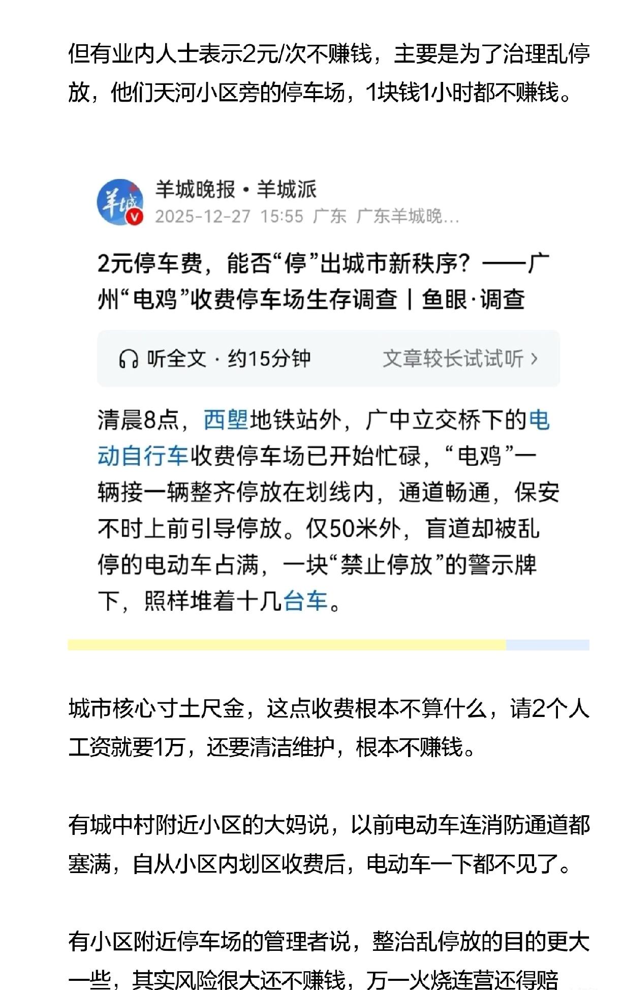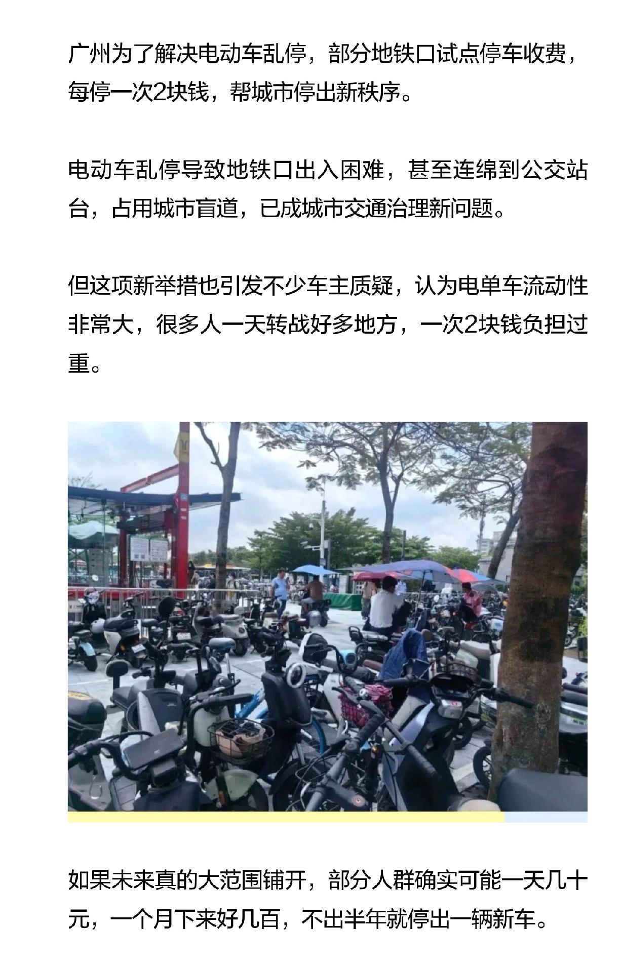 广州地铁口试点停车收费,电动车停一次2元。 每次都用收费解决问题,结果只收了钱,问题没解决。参照好多年前所谓提高汽车停车费解决拥堵,解决了吗?结果现在广州是停车费最贵的城市。