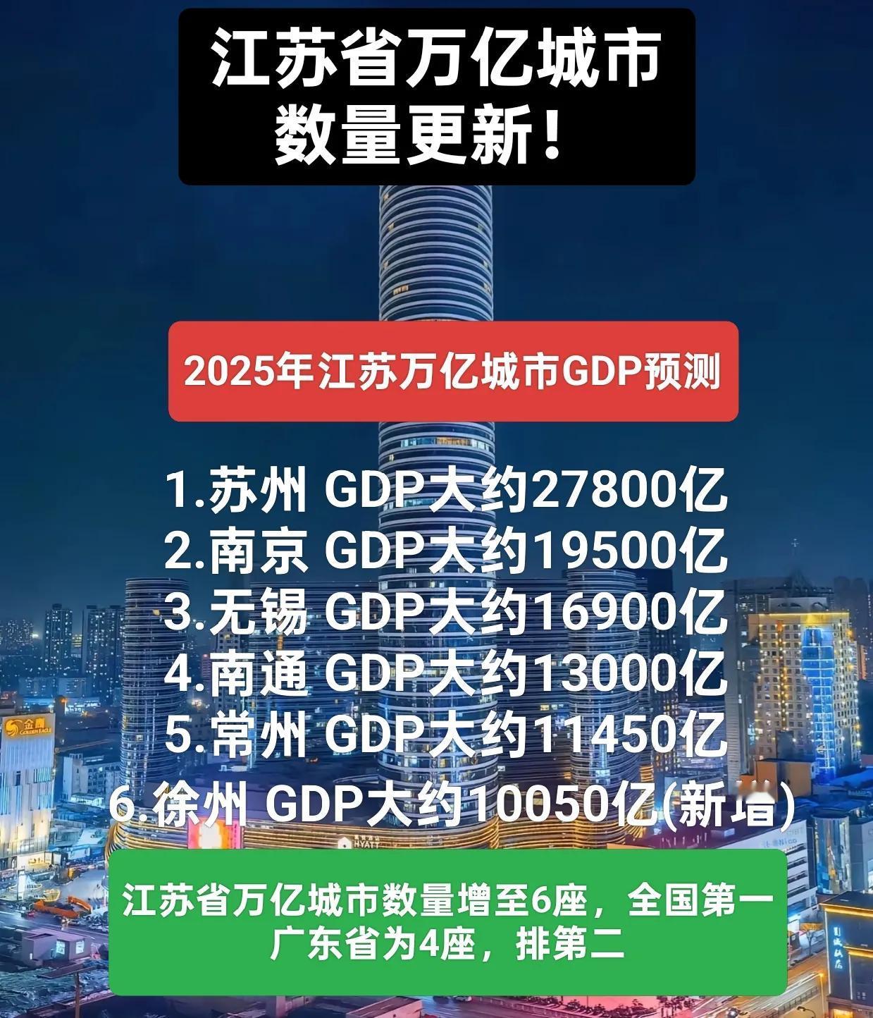 2025年江苏省万亿城市数量将增至6座,是全国万亿城市数量最多的省份,广东省万亿城市数量4座排在第二。 2025徐州GDP破万亿基本上是板上钉钉的事,预测在10050亿左右。 那么江苏省13个城市已经有6个GDP破万亿,接近一半的城市GDP破万亿,江苏可以说是经济发展最成功的省份。江苏