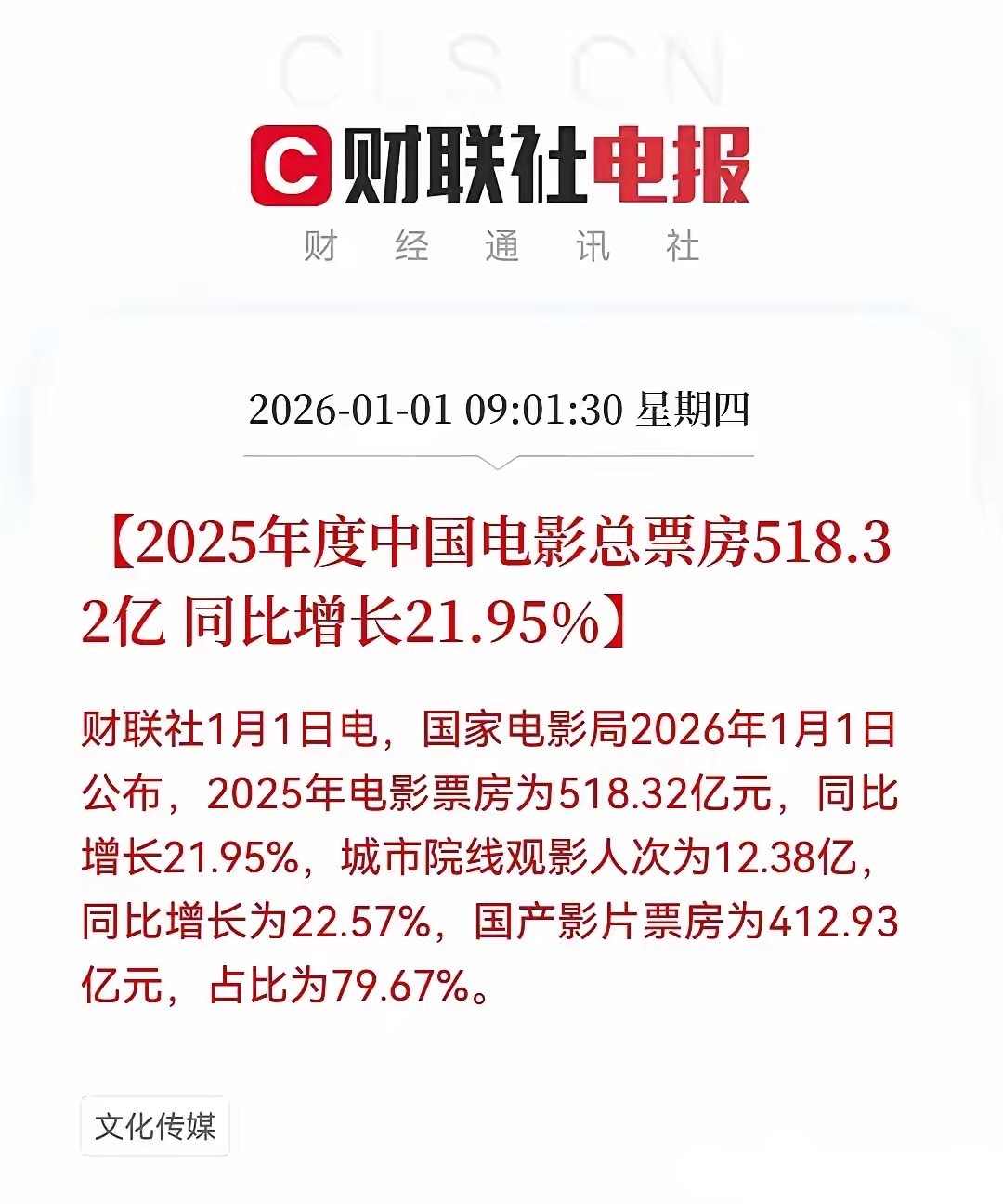重大利好!就在刚刚!中国电影总票房传来大利好…预计明日文化传媒板块也要起飞了,满仓这个方向的股民们,晚上可以去电影院看一场电影庆祝了…财联社元旦最新消息,国家电影局2026年1月1日公布数据,2025年中国电影票房为518.32亿元,同比增长21.95%,国产电影票房412.93亿元,占比达到了79.67%,这个消息对于中国电影产业来说真是振奋人心,中国电影捷报频传,中国电影百花齐放,对于中国电影产业来说是重大利好,2025年中国电影票房火力全开,这不仅显示出电影市场的强劲复苏,更体现了行业在内容创作、市场结构和产业生态上的全面升级,为整个文化传媒领域带来了多维度的积极影响,电影产业正从单一的票房经济转向多元消费,这不仅有利于整个文化传媒板块,对文旅消费也形成了重大利好!股民们!坐稳扶好!受此利好消息影响,预计明日文化传媒板块要大爆发了,核心概念公司有望起飞了…文化传媒二十大热门公司有:蓝色光标、福石控股、易点天下、掌阅科技、利欧股份、宣亚国际、值得买、世纪天鸿、天下秀、因赛集团、中文在线、圣广集团、视觉中国、思美传媒、天龙集团、荣信文化、引力传媒、龙版传媒、光线传媒、万达电影、中国电影、幸福蓝海