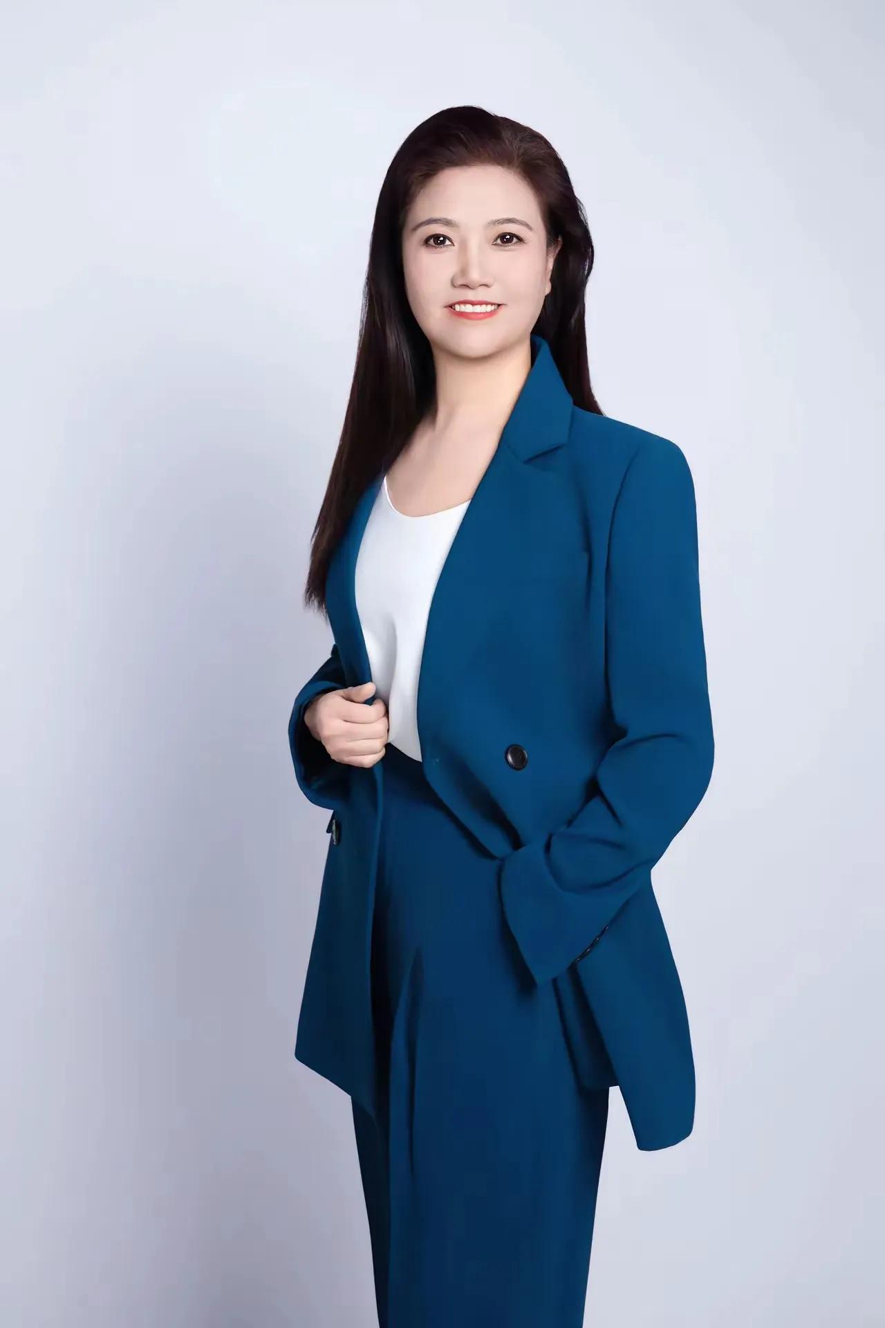 这位职场美女穿着蓝色西装,看起来很有风度。