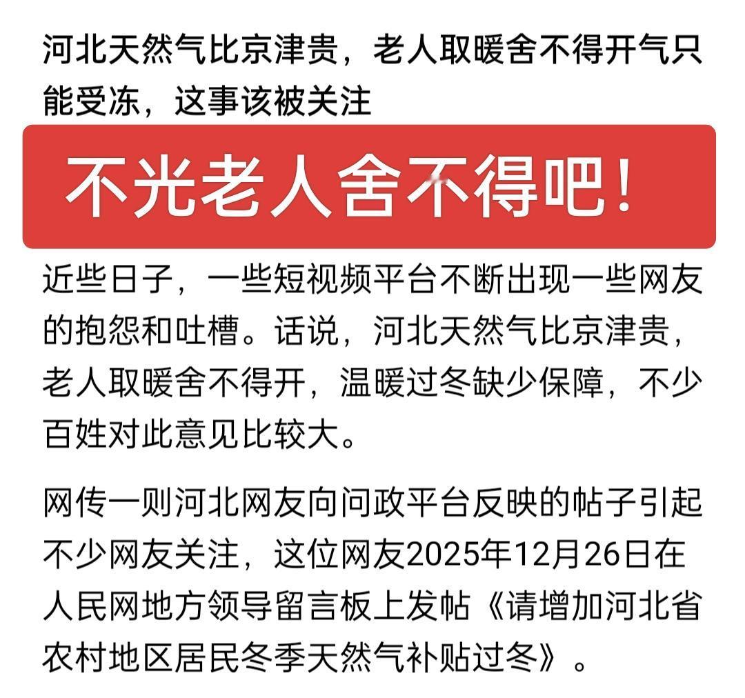不光老人舍不得吧!煤改气开销大了几倍,这还是不敢放开烧的情况,要是和用煤一样的供暖水准,开销会更大!煤改气轰轰烈烈,但老百姓有几个愿意的?烧气烧不起呀!好多都坏了吧,不敢烧,管道中的水结冰把管道撑坏,不在少数吧! 真的不能搞一刀切,好多老百姓是真的消费不起呀!真的是改了个寂寞!
