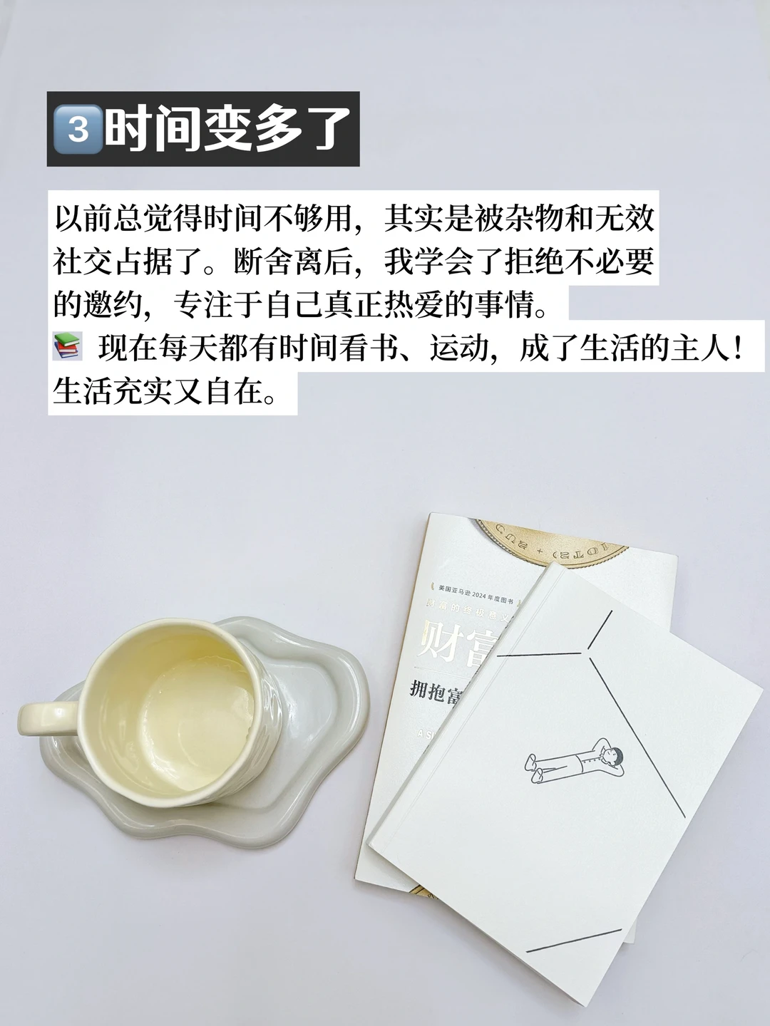 以前总觉得时间不够用,其实是被杂物和无效社交占据了。断舍离后,我学会了拒绝不必要的邀约,专注于自己真正热爱的事情。📚
